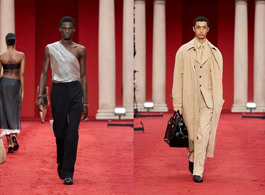 西裝剪裁為八○年代經典男士菁英形象注入當代風格:比例完美,運用常用於女裝系列的細緻面料,打造狂傲細膩的風流態度。燕尾服也以烏干紗與府綢面料,以及無領與無袖的創新剪裁,打造出新時代的正裝魅力。