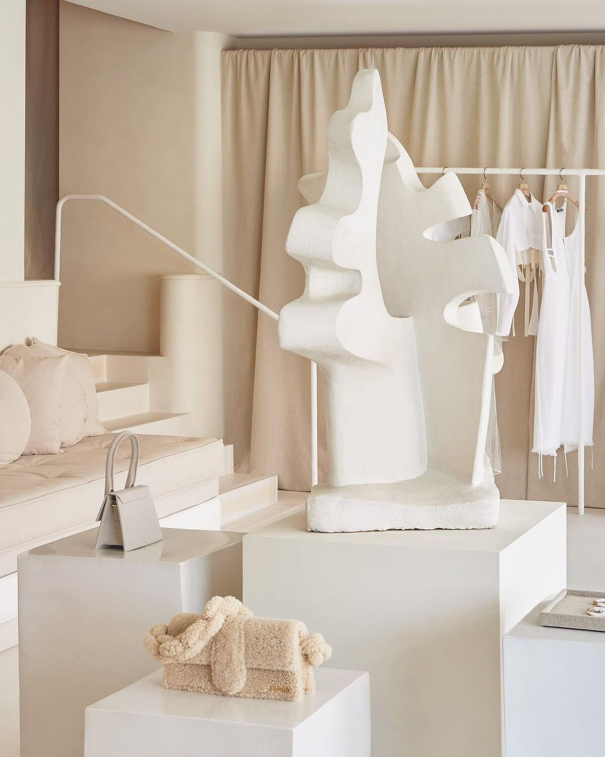 在60餘坪的空間裡,一走進店裡便能感受到Jacquemus獨有的極簡法式風格,帶有一點鄉村的溫馨、一點都會的俐落,米杏與白色的砌牆與擺設,加上一點植栽點綴,外界何如喧囂,只要來到這裡都能立刻靜下心來。