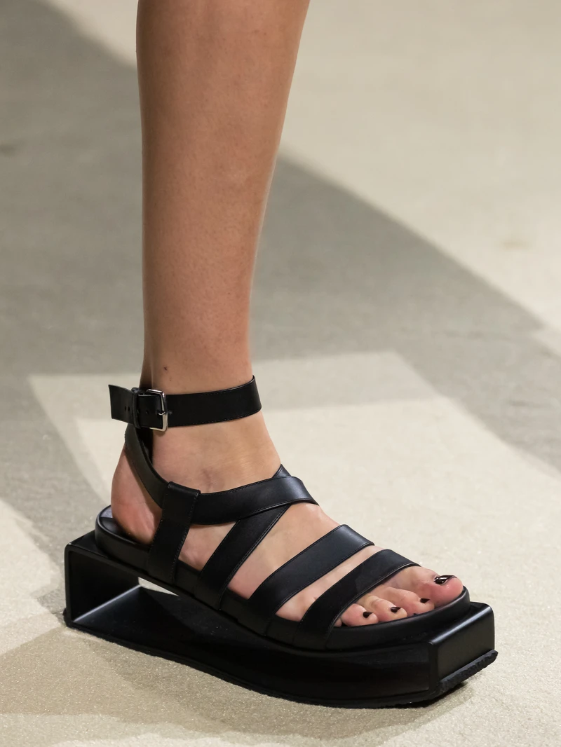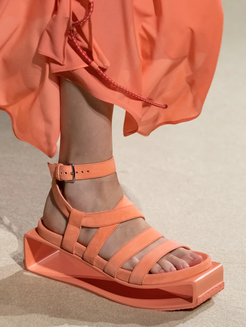 新意嘗試不只有露營元素,愛馬仕此季秀上僅有出現一雙鞋履,看似簡簡單單的綁帶涼鞋,亮點之處在於鞋底的中空結構,透視設計呼應春夏時節大家追求的清爽感。