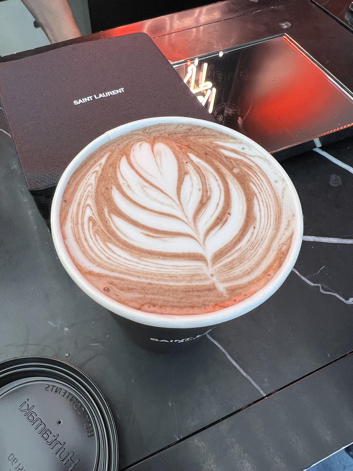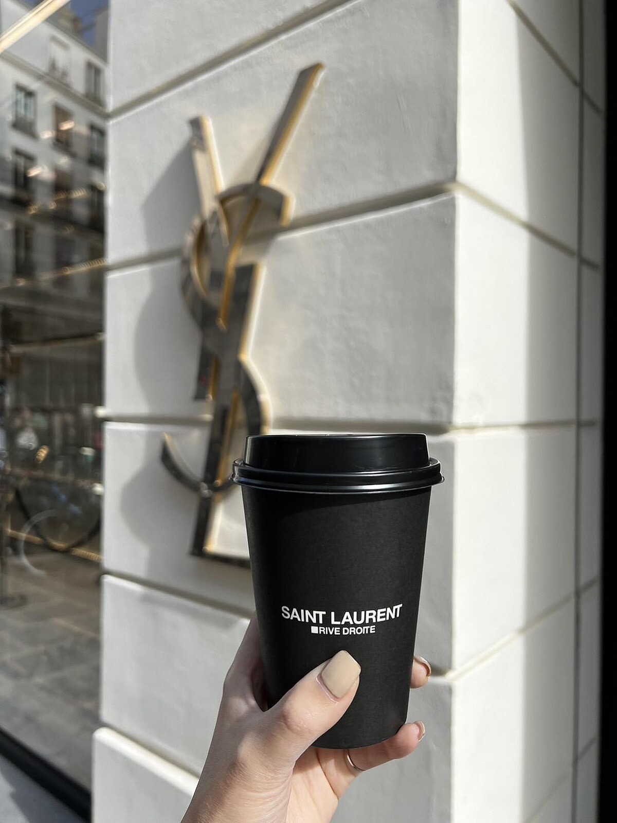 YSL Café延續品牌的酷帥風格,採用全黑的店舖設計,就連咖啡杯也是黑色系,僅壓印白色的Sanit Laurent標誌,提供美式咖啡、拿鐵、熱可可、香料奶茶,也有可頌、餅乾等小點心,執得一提的是,這家YSL Café還有販售隨身碟、開瓶器、保險套等小物。