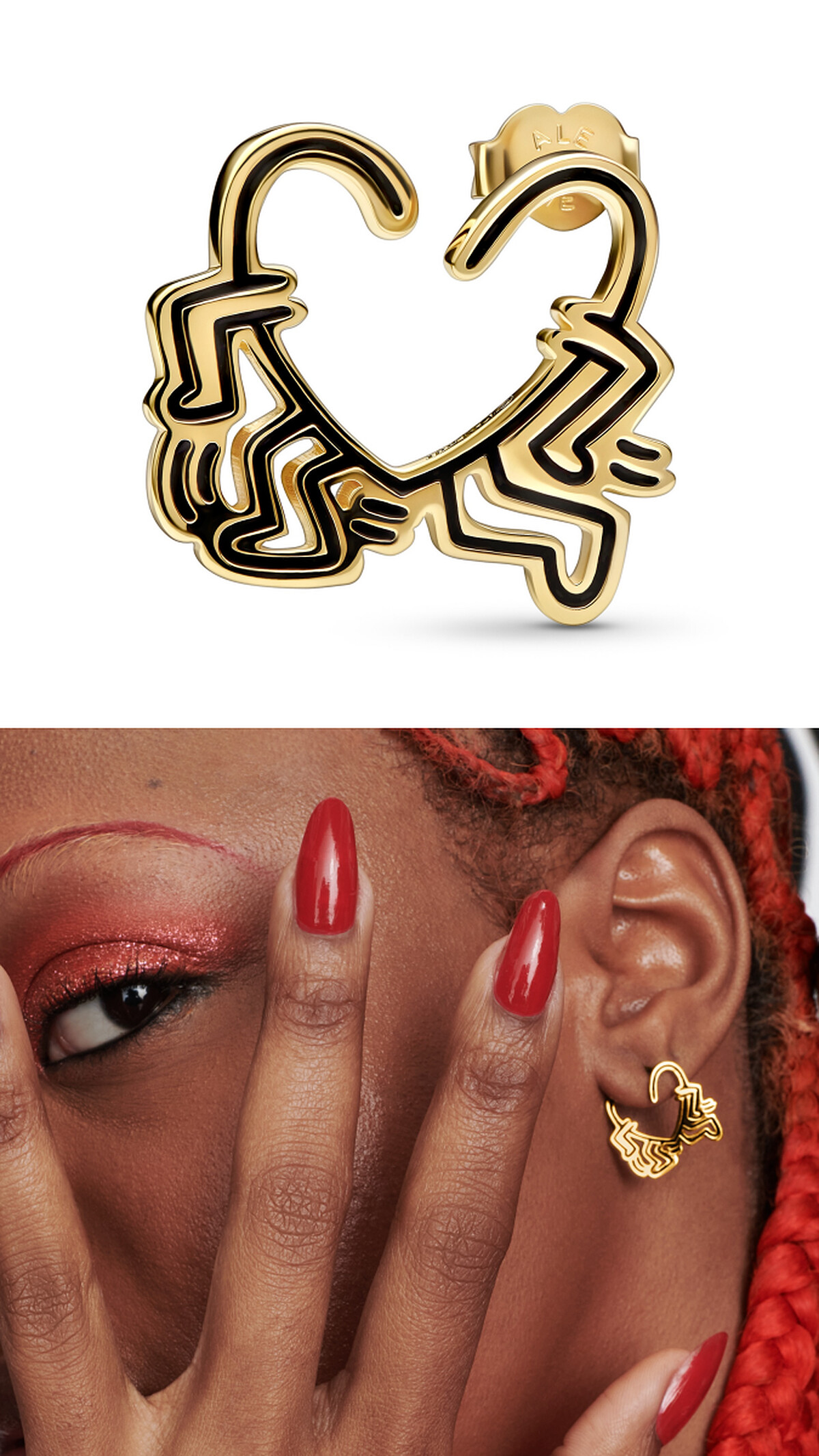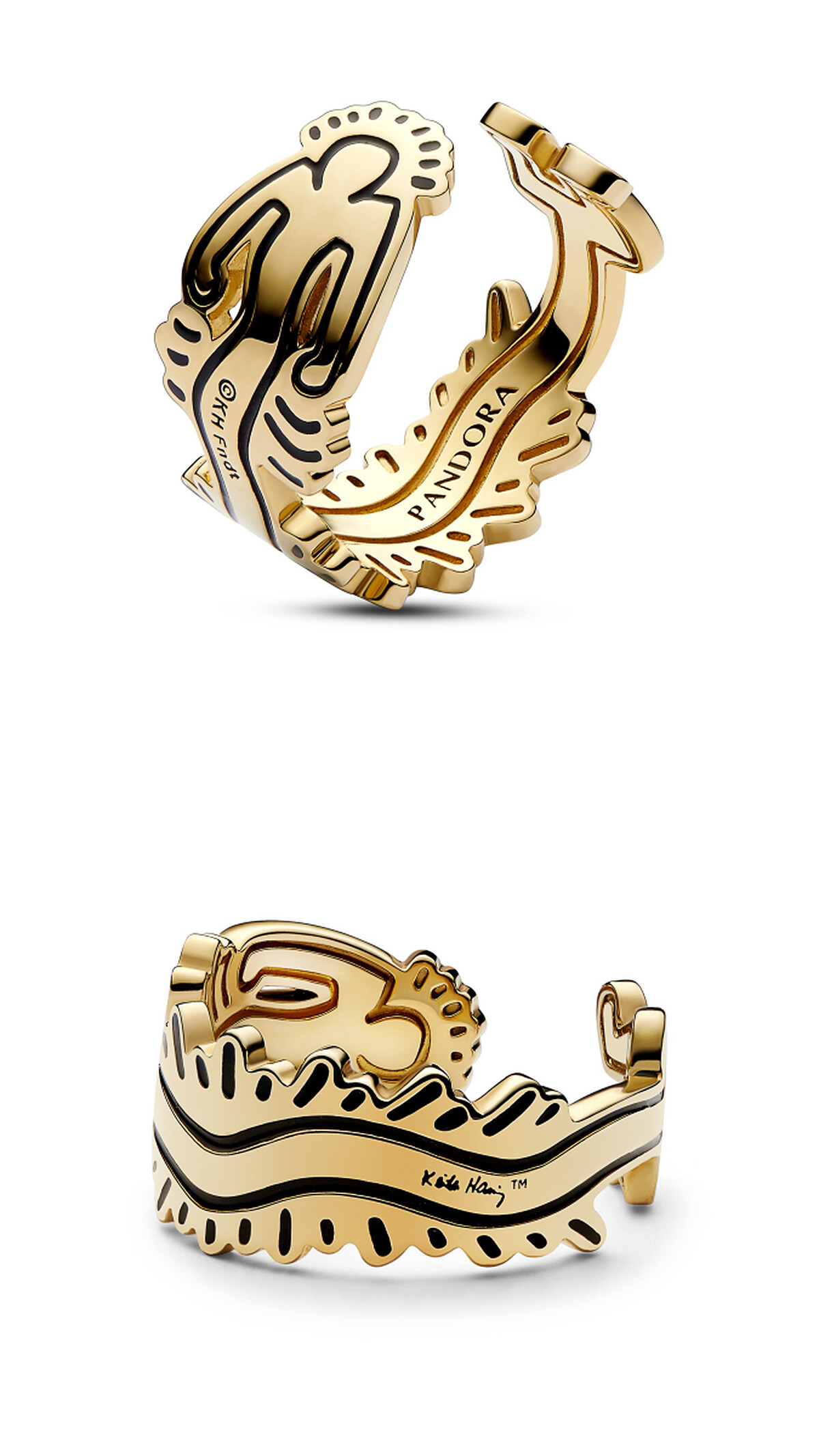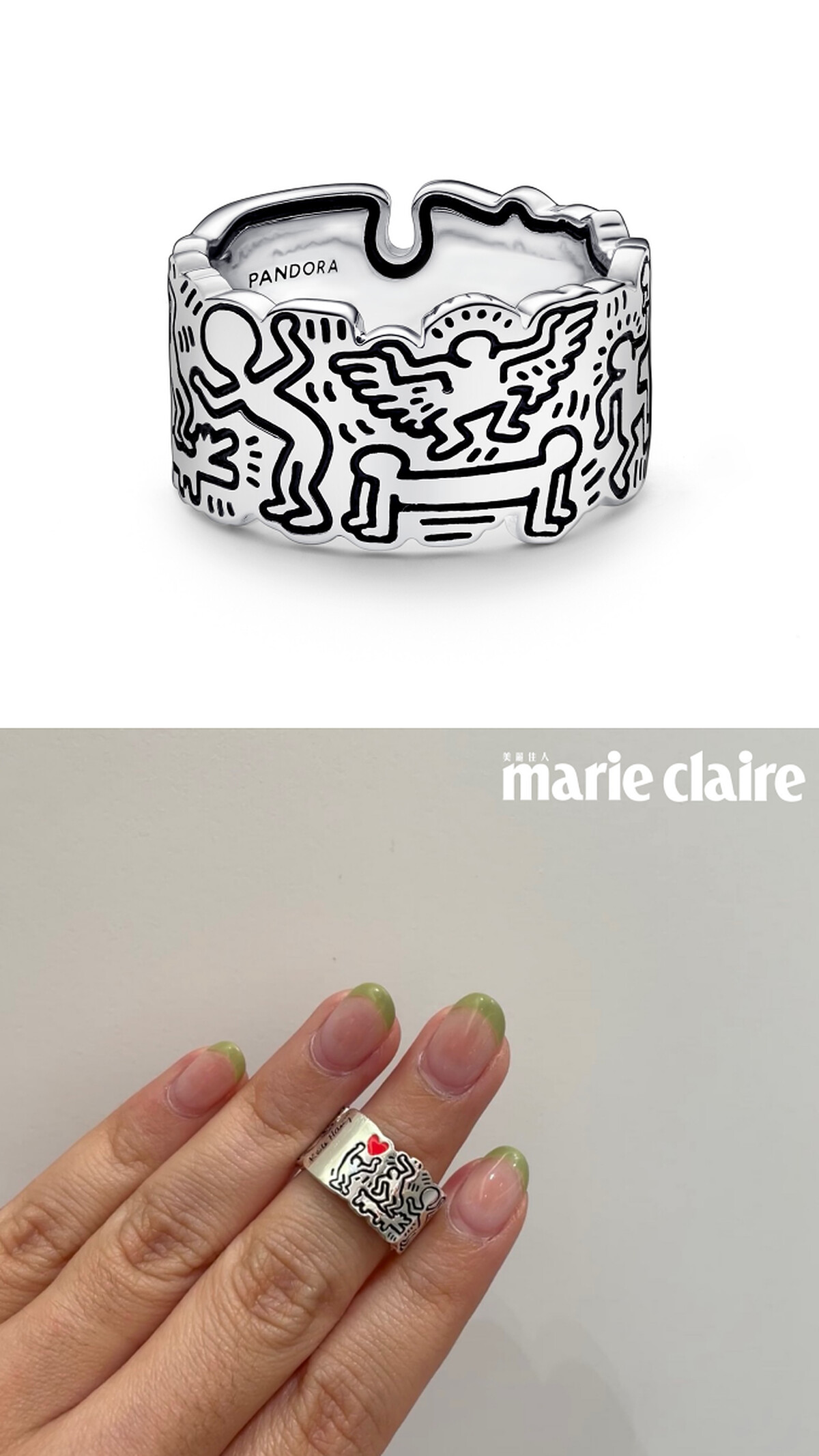 Keith Haring大家最熟悉的,大概就是滿版的塗鴉了吧?吠叫的狗、各種姿勢的人體、天使以及愛心所構成的豐富畫面,Pandora還依照塗鴉的輪廓刻出戒指邊緣的鋸齒線條,顯現細節巧思。