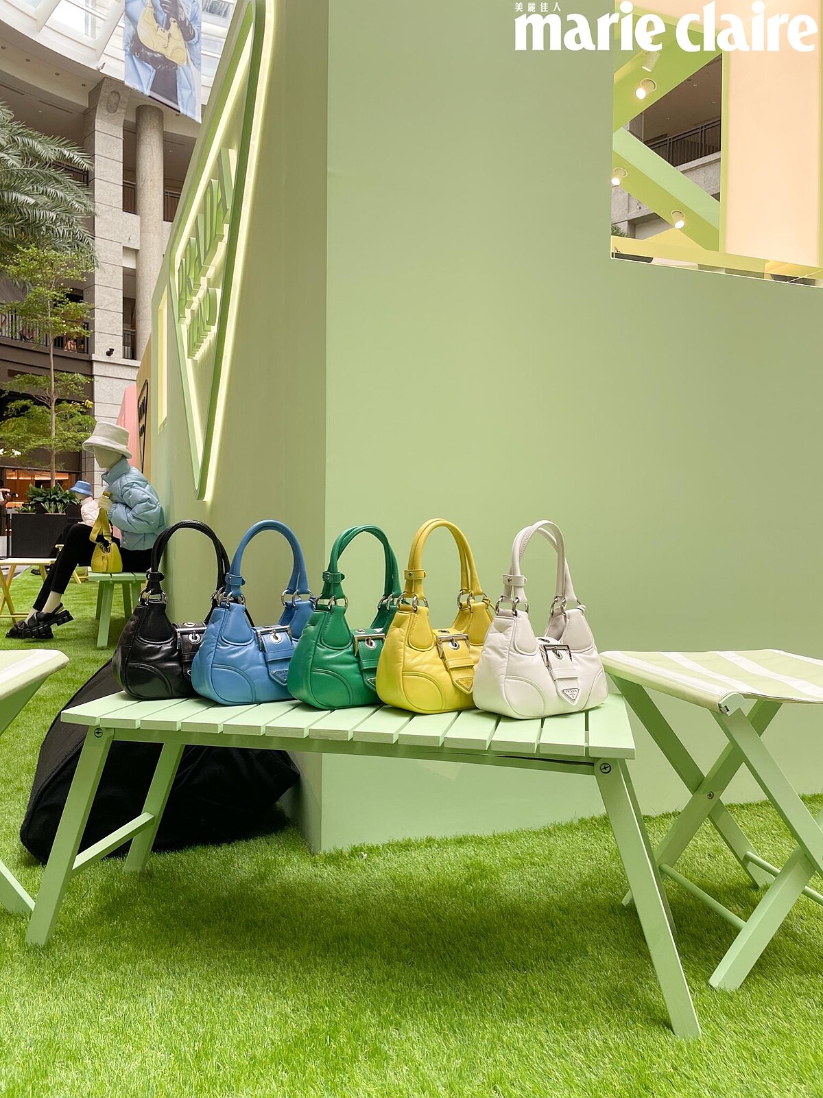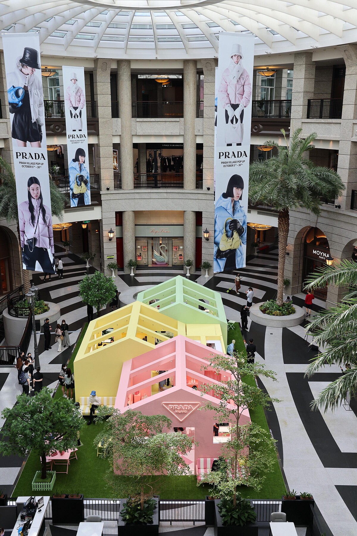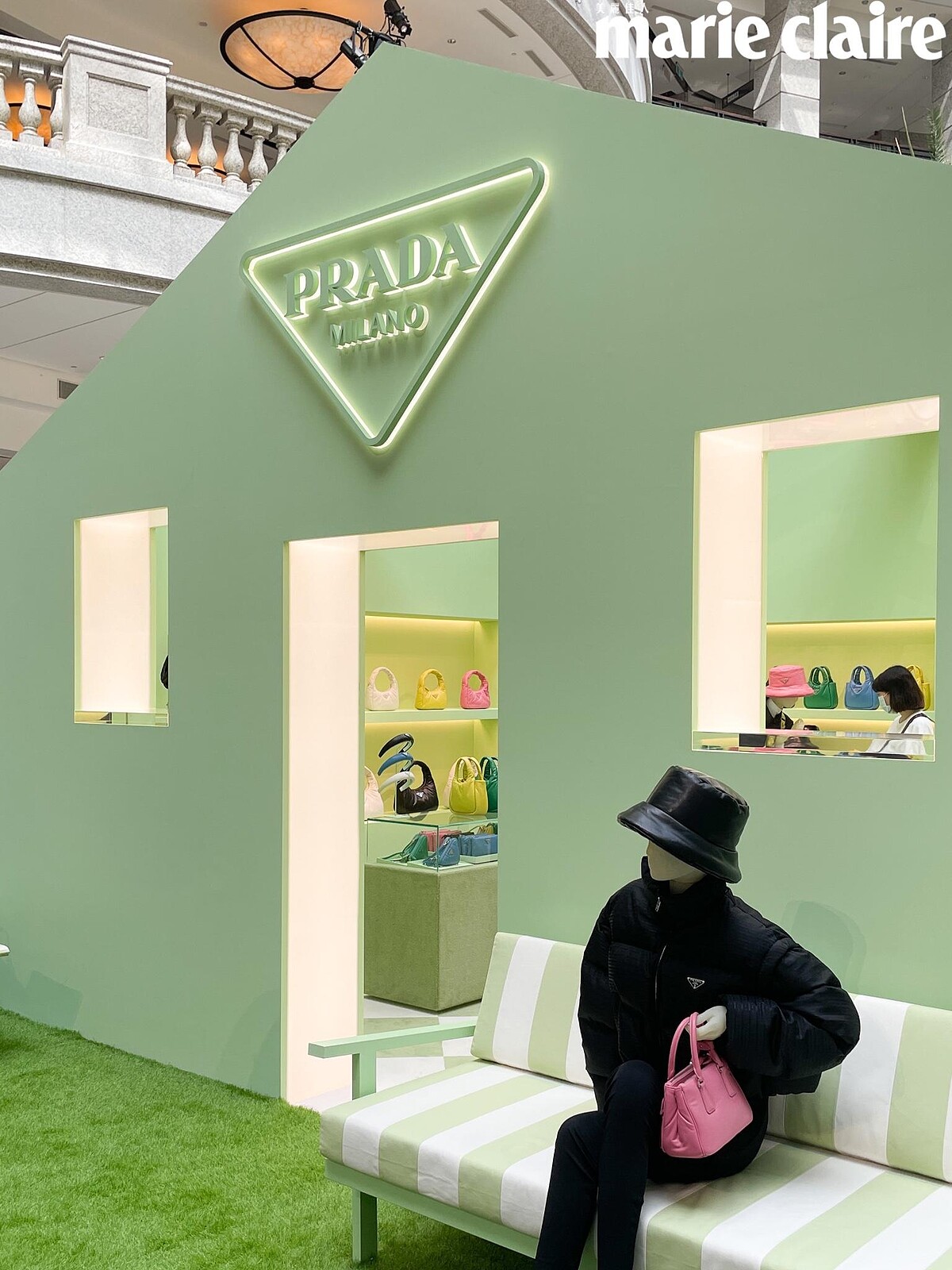 依序由薄荷綠、檸檬黃以及嫩粉色所建構而成的Prada Village,俐落的三角屋頂呼應品牌的logo形狀,抬頭一望便能見到明亮的Prada三角標誌。