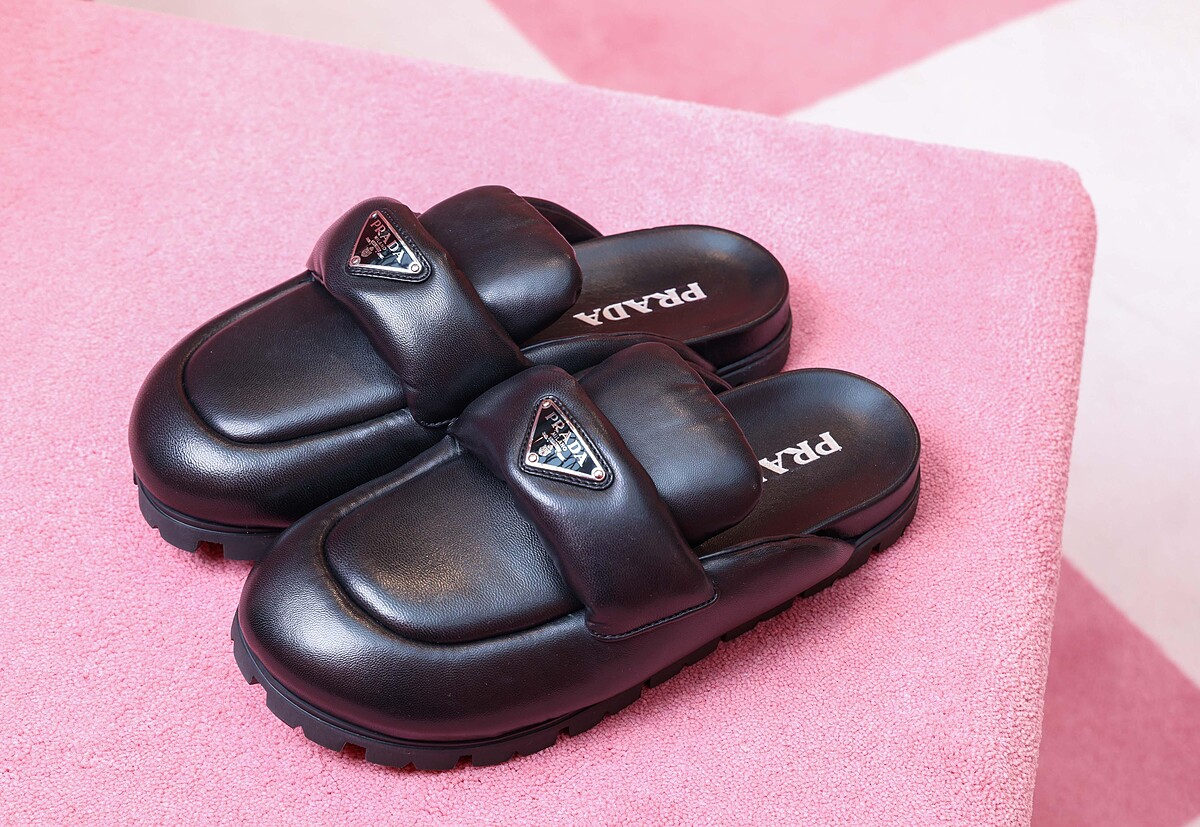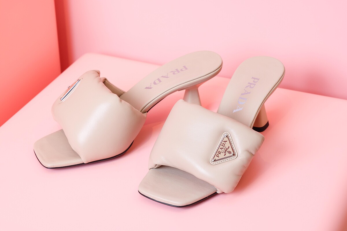用極其柔軟的Nappa皮革詮釋怎麼穿都好搭的低跟涼涼鞋,蓬蓬的皮革綴上堅硬的Prada三角logo,對比個性卻毫不違和。