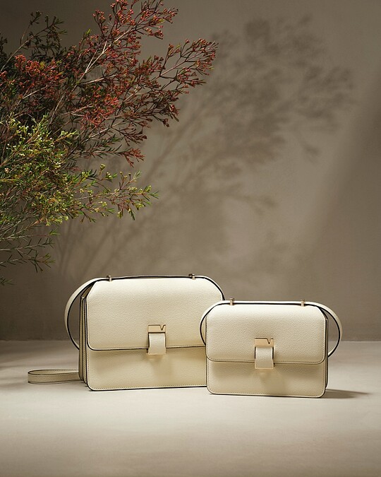 方正的包身輪廓,在鎖釦上注入象徵品牌名稱的V字凹口,推出Valextra最具代表性的羊皮紙白色。