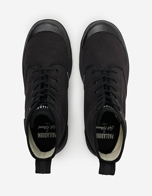 Maison Kitsuné將Palladium軍靴以帆布搭配橡膠材質打造,保留靴款原有的輪廓和鞋帶穿孔旁的Palladium標籤裝飾,特別的是,將軍靴側邊寫著Palladium的圓形標誌變成Maison Kitsuné最具辨識度的小狐狸圖案,並在鞋墊上壓印Palladium X Café Kitsuné的聯名字樣。
