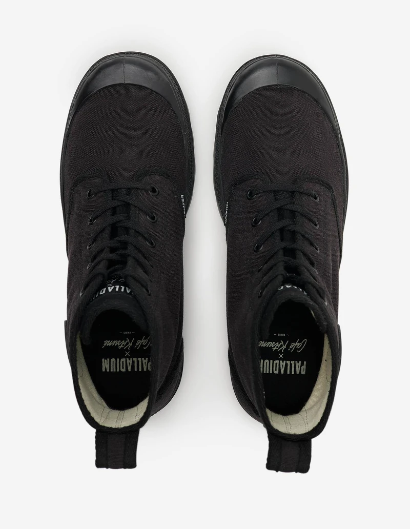 Maison Kitsuné將Palladium軍靴以帆布搭配橡膠材質打造,保留靴款原有的輪廓和鞋帶穿孔旁的Palladium標籤裝飾,特別的是,將軍靴側邊寫著Palladium的圓形標誌變成Maison Kitsuné最具辨識度的小狐狸圖案,並在鞋墊上壓印Palladium X Café Kitsuné的聯名字樣。