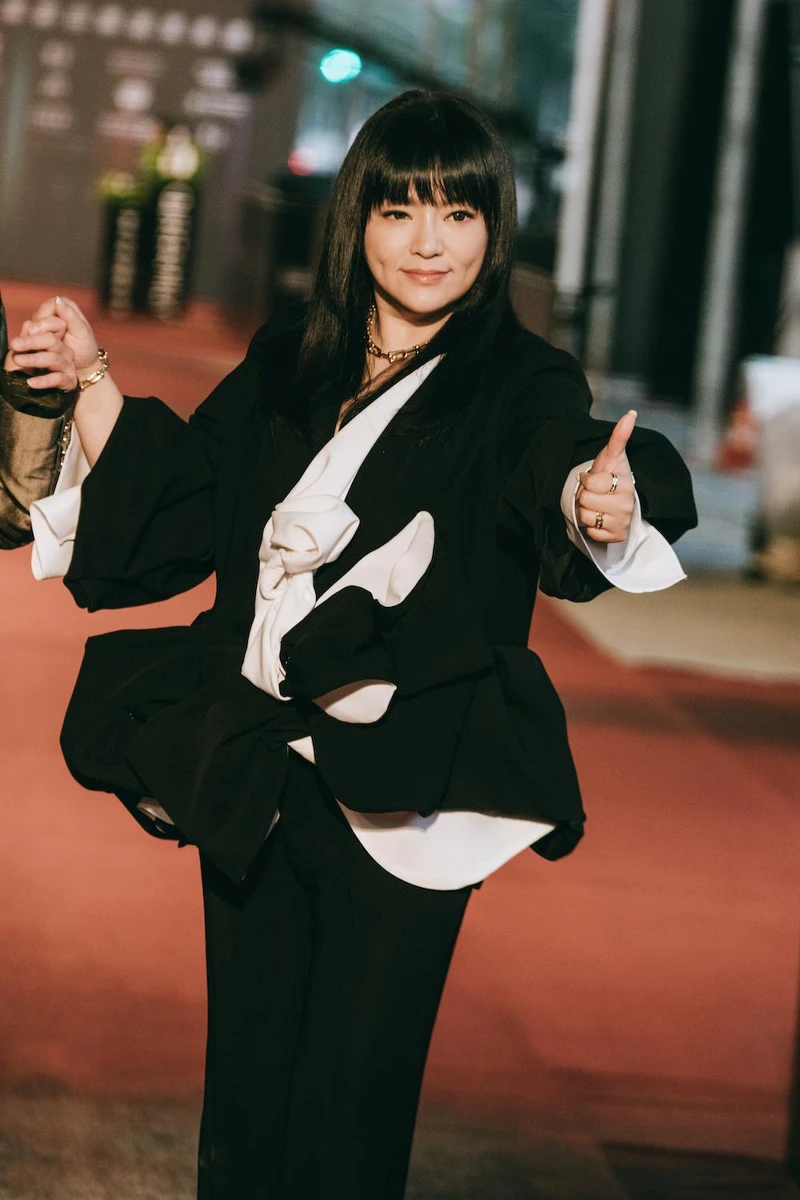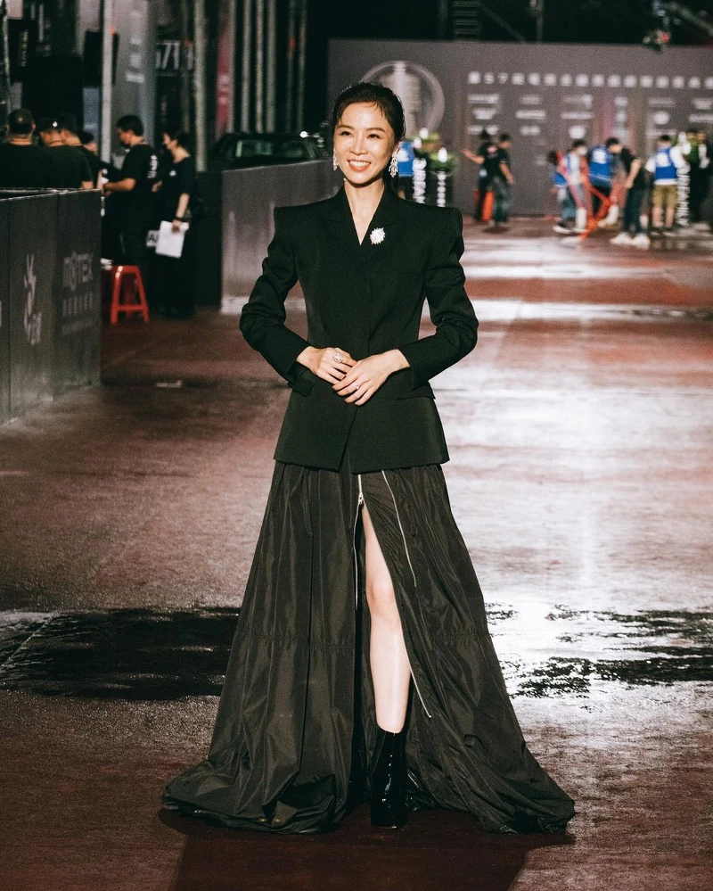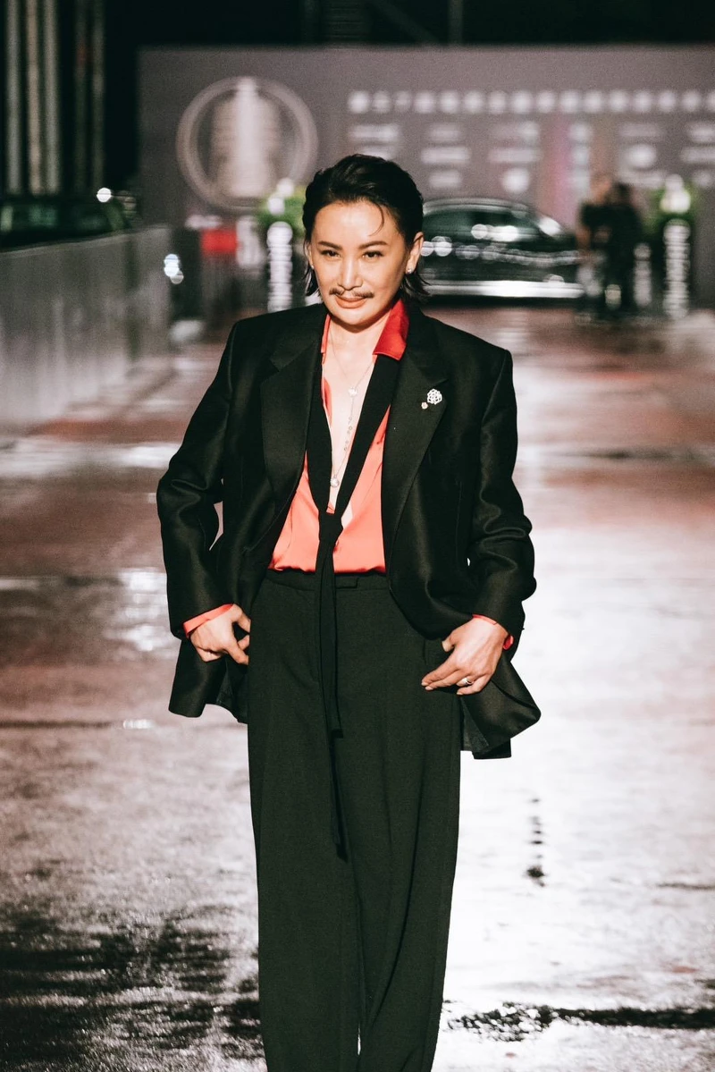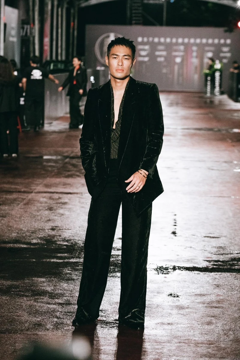 本身就有一股瀟灑魅力,楊祐寧選擇天鵝絨的套裝,有別婚禮上的緊身剪裁,今晚紅毯選擇寬鬆飄逸設計,演繹《華燈初上》「潘文成」的痞痞個性。