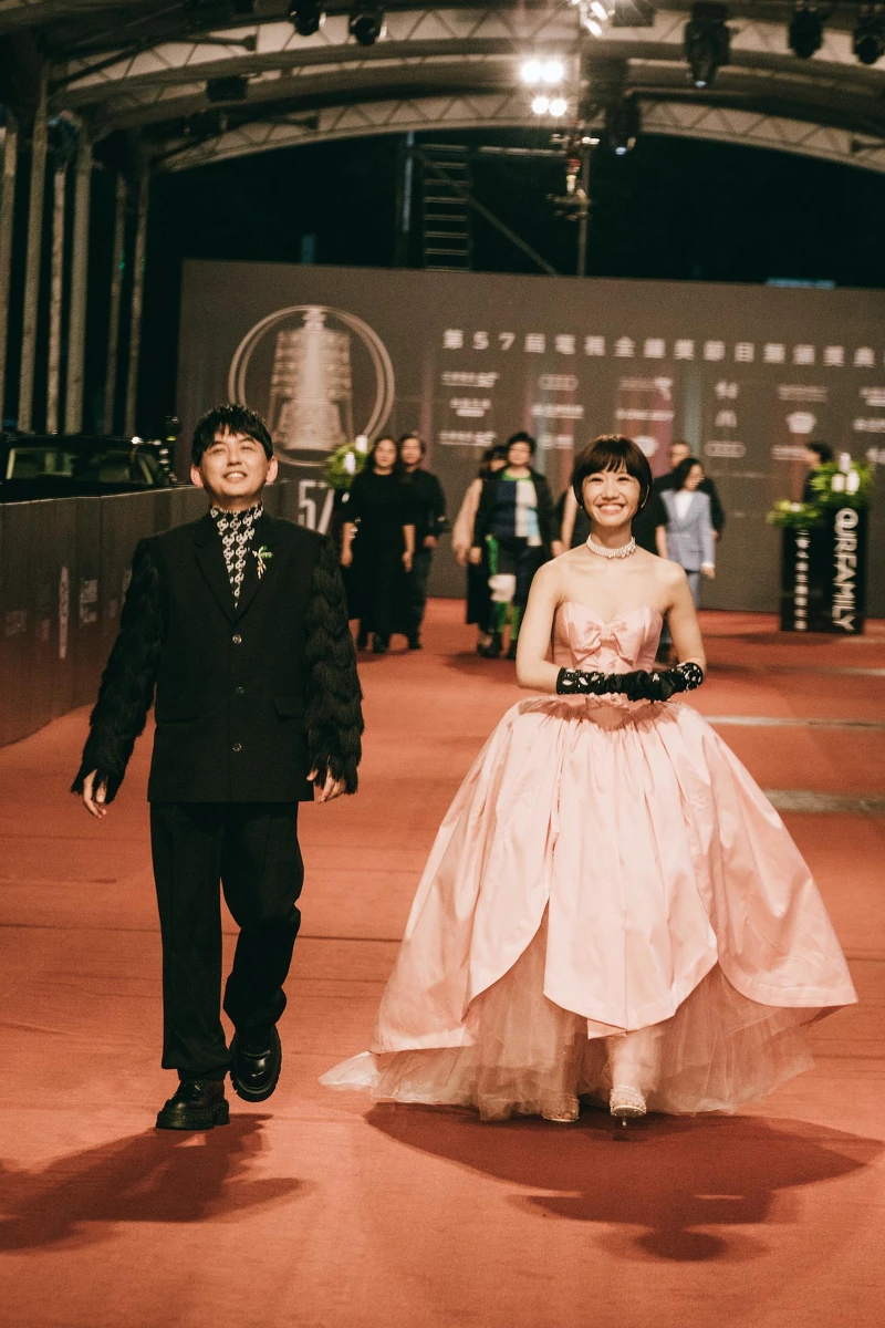接著登場的黃子佼、黃路梓茵Lulu師徒檔,以《婚禮歌手》入圍2022金鐘,兩人的穿搭悄悄地呼應到節目的「婚禮」主題——黃子佼一席俊挺的西裝,亮點在於兩邊動感十足的流蘇袖子;Lulu則是粉紅色的蝴蝶結蓬蓬禮服,裙擺還是浪漫的花苞輪廓,搭配Rene Caovilla的環繞高跟涼鞋,既甜美又有氣質。