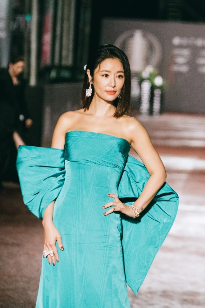 華燈幫壓軸登場!林心如一身貴氣又華貴土耳其藍及地禮服,耳尖用寶格麗的鑽石耳環點綴,簡單又大方。