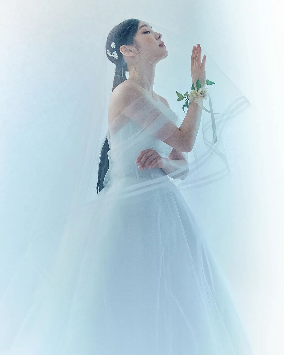 如果問說最能代表金妍兒的色彩,那一定是如冰雪般的白色,金妍兒拍攝的4張婚紗照中,就有3張是穿著白色婚紗,包括甜美風的斜肩細褶白紗、氣質風的緞面細肩魚尾禮服和甜美風的馬甲式蓬裙禮服。另外一套則是來自高級訂製大師Oscar de la Renta所打造的亮黃色細褶婚紗。