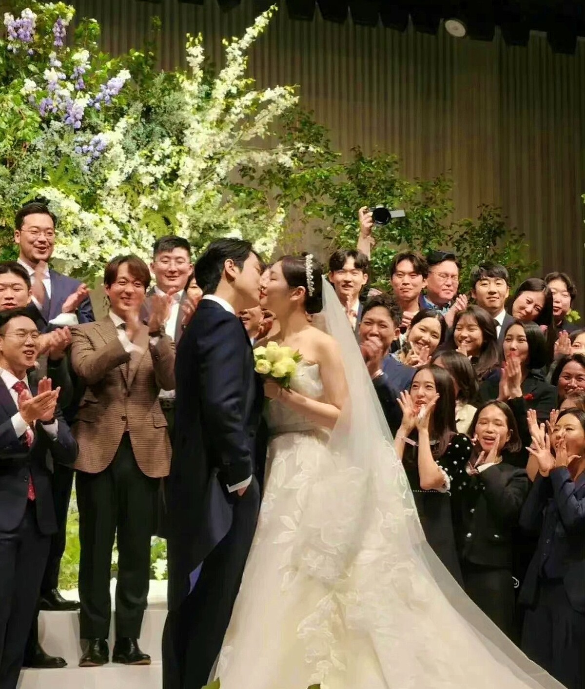 金妍兒、高祐琳婚禮當日,金妍兒則換上黎巴嫩設計師Elie Saab的手工訂製婚紗,擅長細膩刺繡和立體花卉堆疊,金妍兒身上這套集結這兩大設計重點,不僅展現出她長久訓練滑冰的姣好身材,還襯托出她若隱若現的白皙肌膚,加上水鑽皇冠的點綴,讓金妍兒成為最優雅、迷人的新娘。