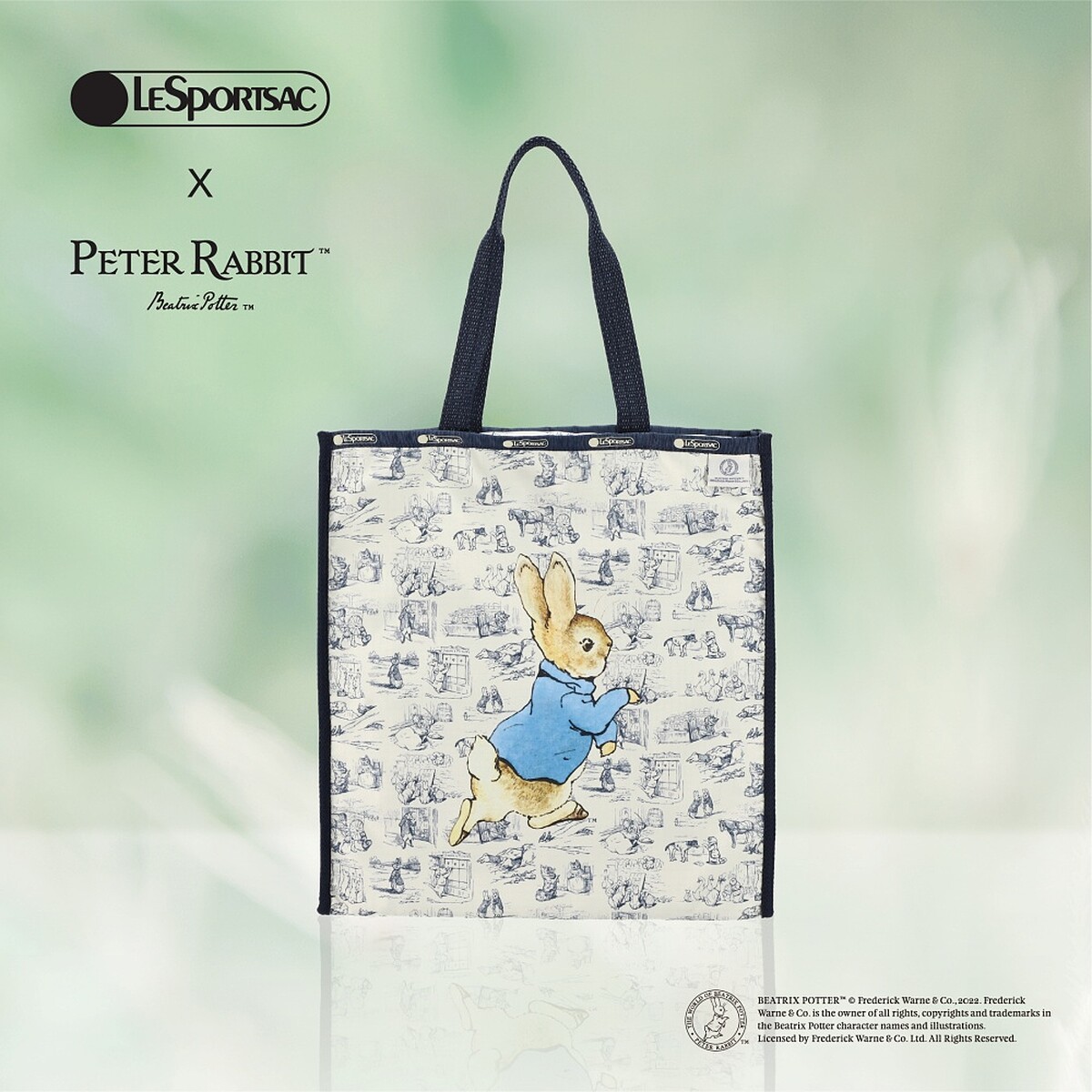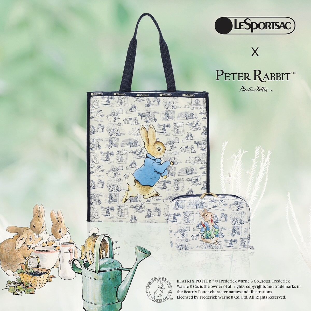 LeSportsac X 彼得兔二度合作,主要印花圖案《田園風光》以藍白色系打造,召集彼得兔和故事中小夥伴,透過手繪風格呈現出在麥奎格先生菜園中的日常生活、偷吃胡蘿蔔的嬉鬧場景,注入LeSportsac經典商品包括手提袋、後背包、化妝包、零錢包、束口水桶包...等。