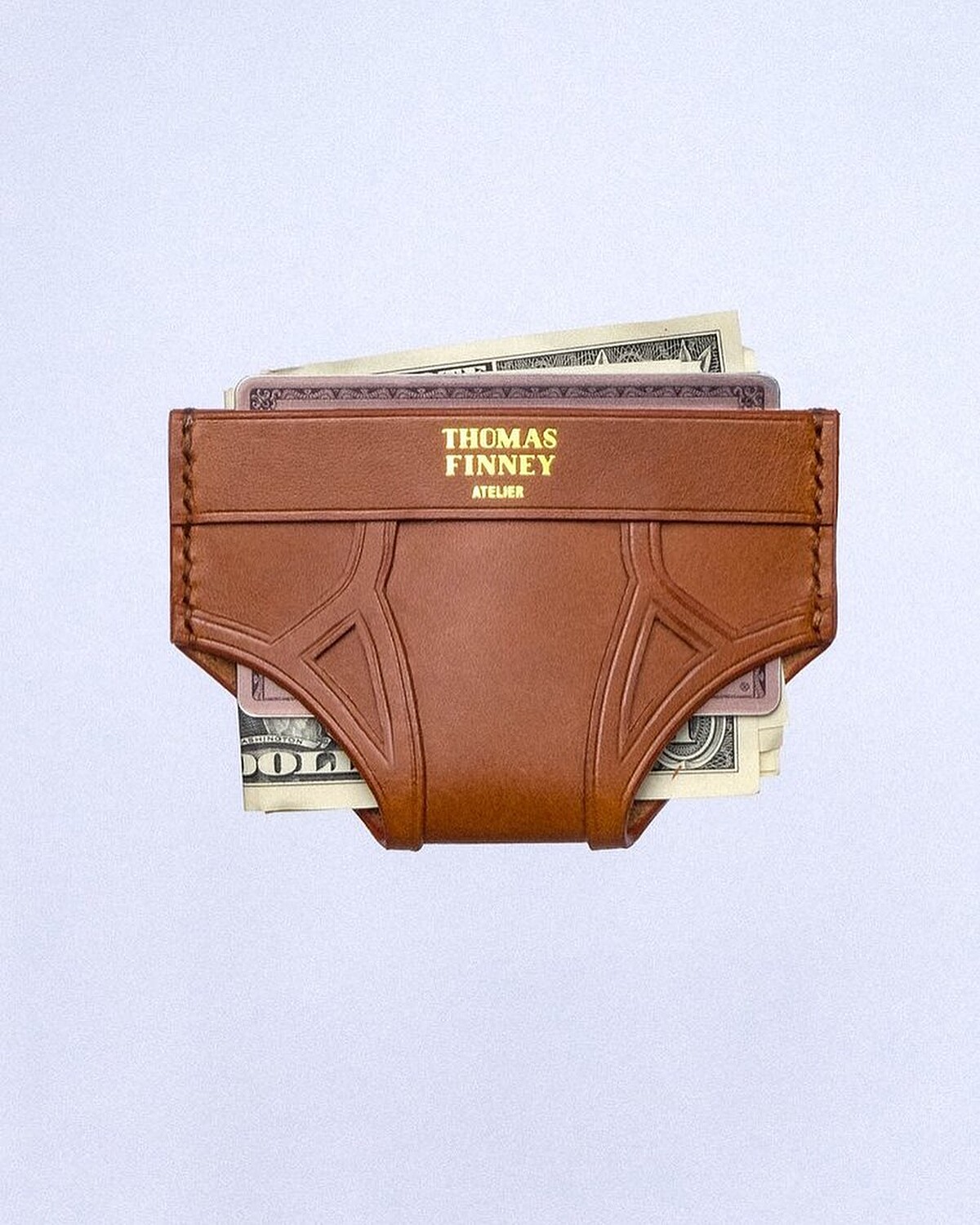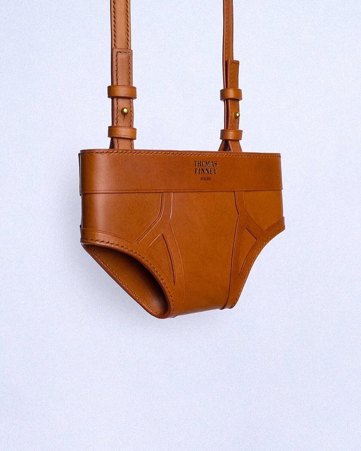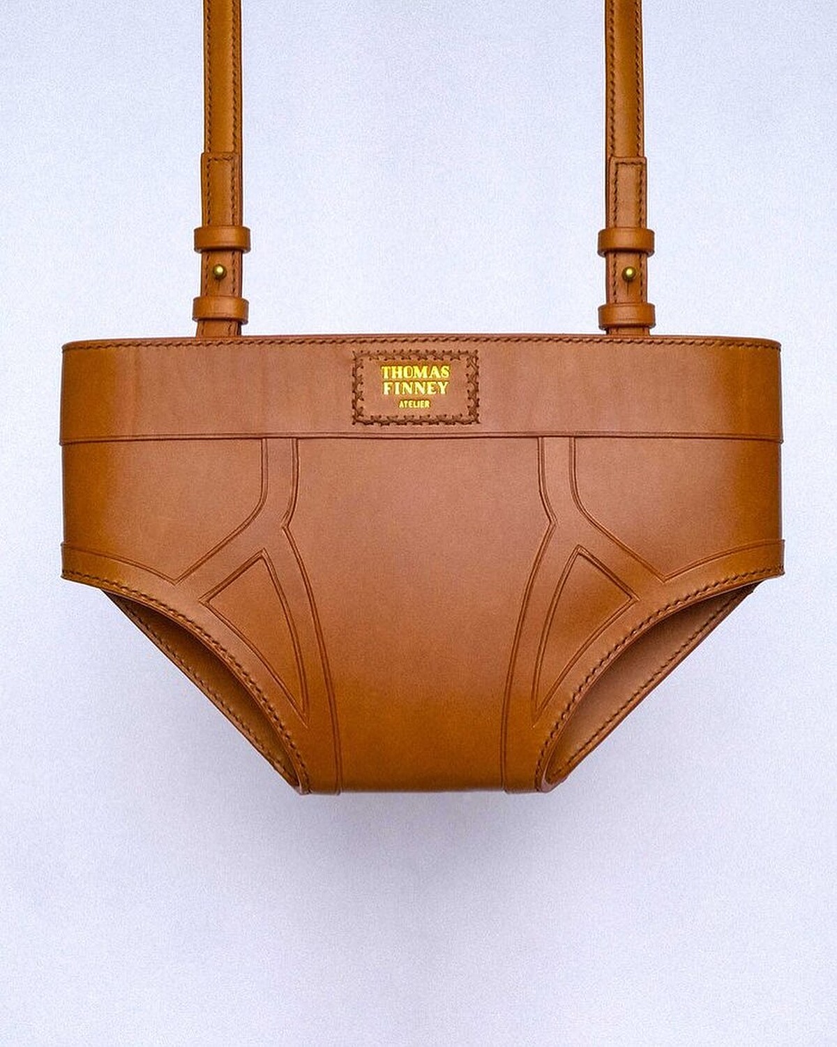 人氣爆增的底褲包,其實是來自美國的設計師品牌Thomas Finney,他曾經在Thom Browne底下工作,後來創立了個人同名品牌,堅持選用義大利頂級的皮革原料,並以細緻的手工製作聞名,更與Club Monaco有過合作。