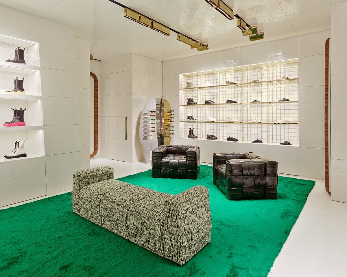 不論品牌在誰手上,Bottega Veneta的編織基因永遠存在,只是在Bottega Veneta新光三越A9店上,品牌再以不同形式展現,包括整面落地的木紋框架、大面積的白色磚牆、大格編織座椅和擺放商品的黃銅金屬陳列框。