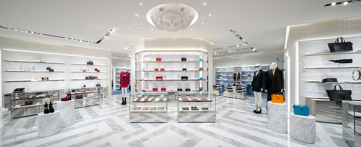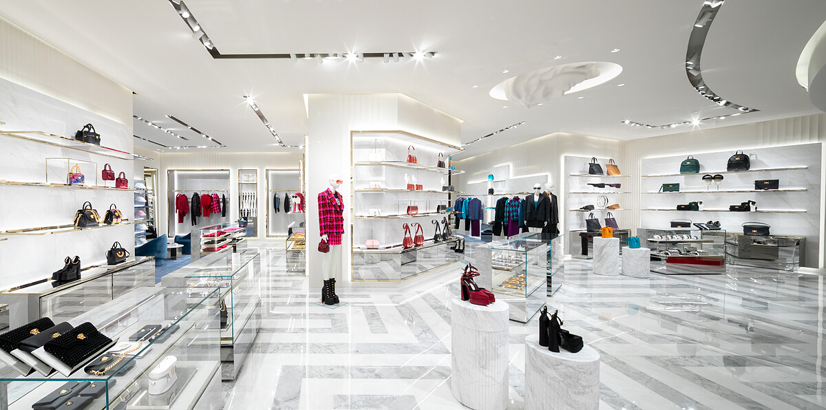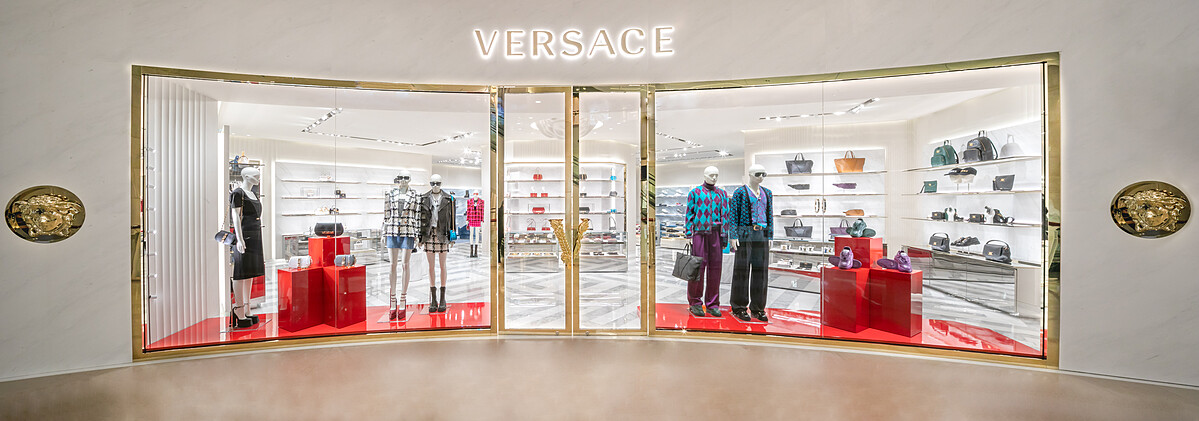 遷移至101購物商場的三樓,將店裝改以超明亮的白金配色,襯托出品牌的富豪氣質。一走到店門口,簡潔的白牆,左右兩側有著梅杜莎頭像點綴,玻璃大門上還有巴洛克式的V字門把裝飾。