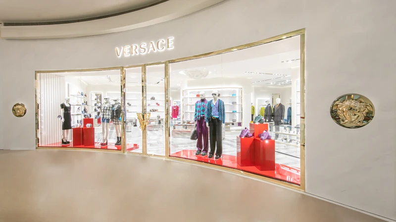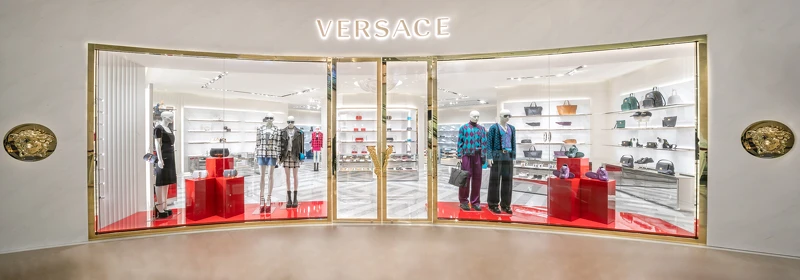 遷移至101購物商場的三樓,將店裝改以超明亮的白金配色,襯托出品牌的富豪氣質。一走到店門口,簡潔的白牆,左右兩側有著梅杜莎頭像點綴,玻璃大門上還有巴洛克式的V字門把裝飾。
