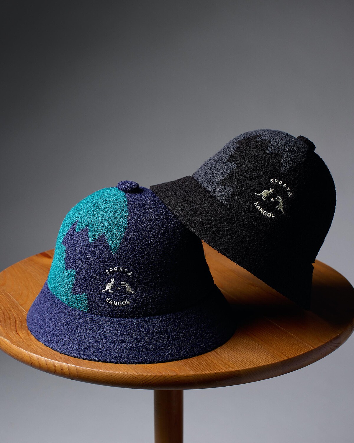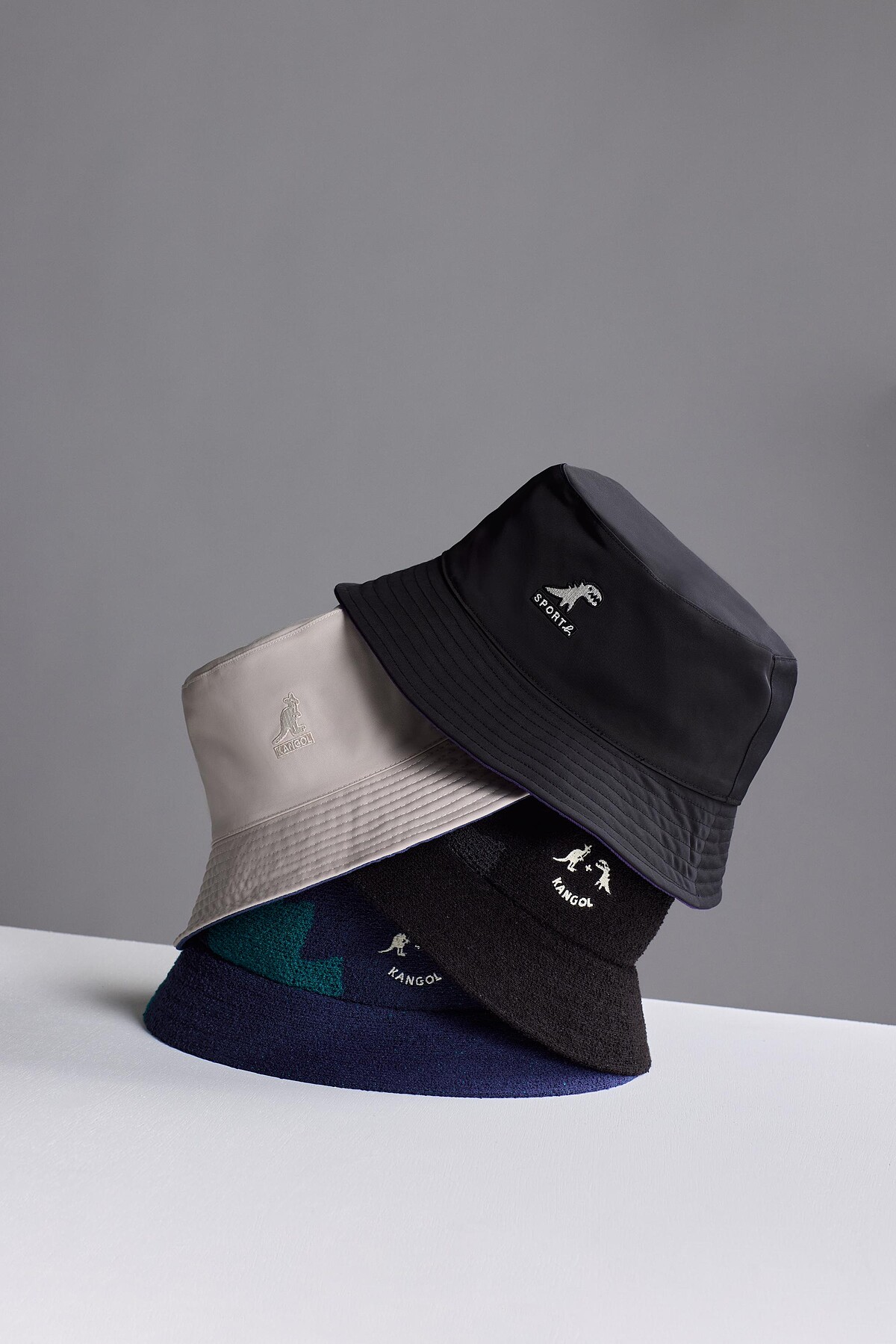 Kangol袋鼠及Sport b.Dino恐龍之間放上「+」符號,代表著兩個品牌之間的合作。拼接設計將恐龍圖像放大作為帽款裝飾,運用紗線打造毛絨的療癒效果,有藍與黑兩款色選。