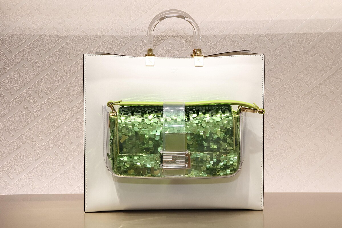 位於整間店的中央,是收藏在透明櫃中的Fendi Baguette復刻款,包括林心如手上的粉色亮片、萬花筒款和柔軟皮草款。