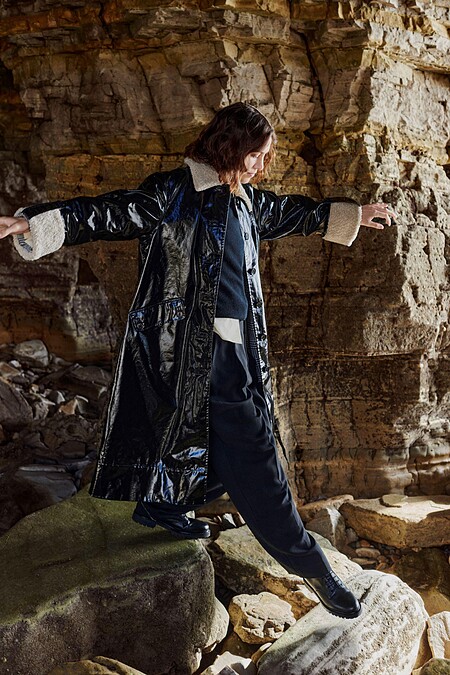 油布外套良好的抗雨與防風特性,即便到了現代也不輸現在諸多機能設計,其中這款外套是 Alexa Chung 最喜歡的單品,配有大口袋以及燈心絨衣領與泰迪熊毛絨內裡,讓經典的外套輪廓添入更多現代氛圍。
