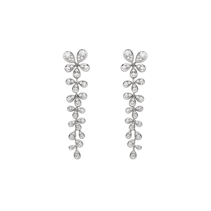 白K金耳環,鑲嵌38顆圓形切割鑽石(總重約2.81克拉)、128顆密鑲鑽石(總重約0.26克拉)。垂墜鑽石長鍊可拆卸,單獨配戴兩朵花型貼耳耳環。