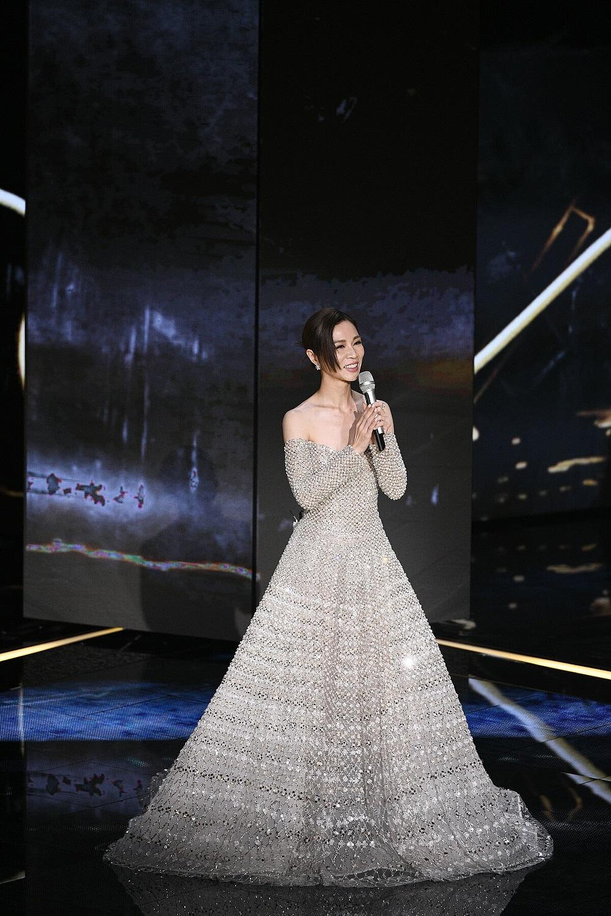 實在太美!擔任頒獎人的賈靜雯這一身戰袍走上舞台引起一陣騷動,搭配全套Tiffany & Co.珠寶,讓深V高衩禮服性感得更高級!