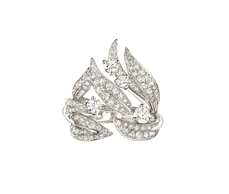 18K白金,鑲嵌1顆圓形切割鑽石及314顆明亮式切割鑽石。建議售價NTD1,936,000元