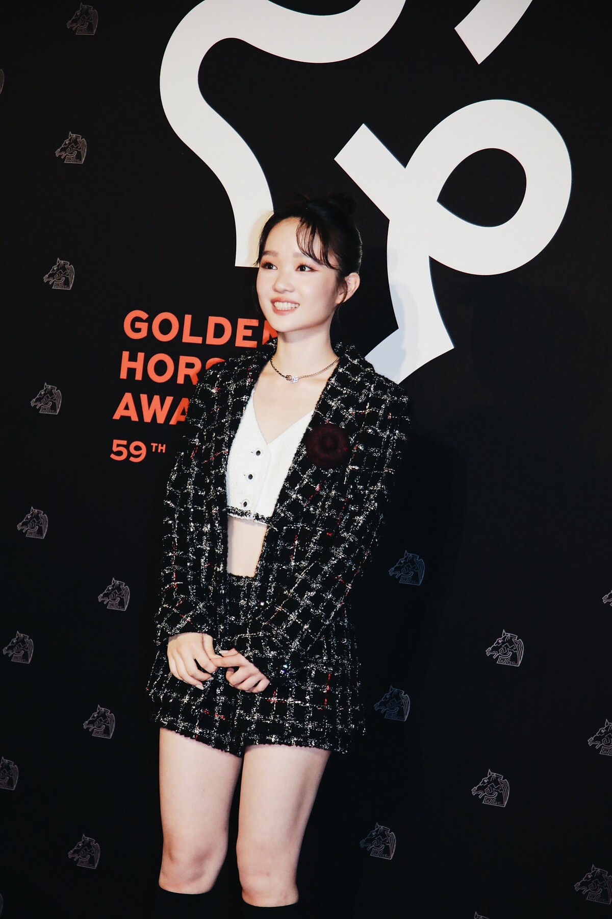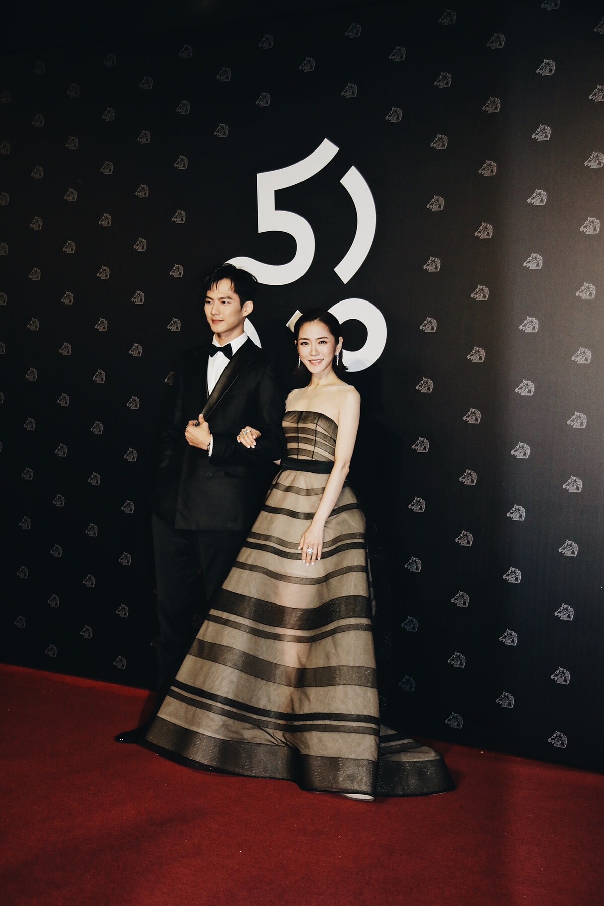 金馬59星光大道主持人由楊千霈+吳念軒組合負責——裸膚與黑色的條紋交錯,不只襯托出楊千霈的氣質,也將身型修飾得玲瓏有致。