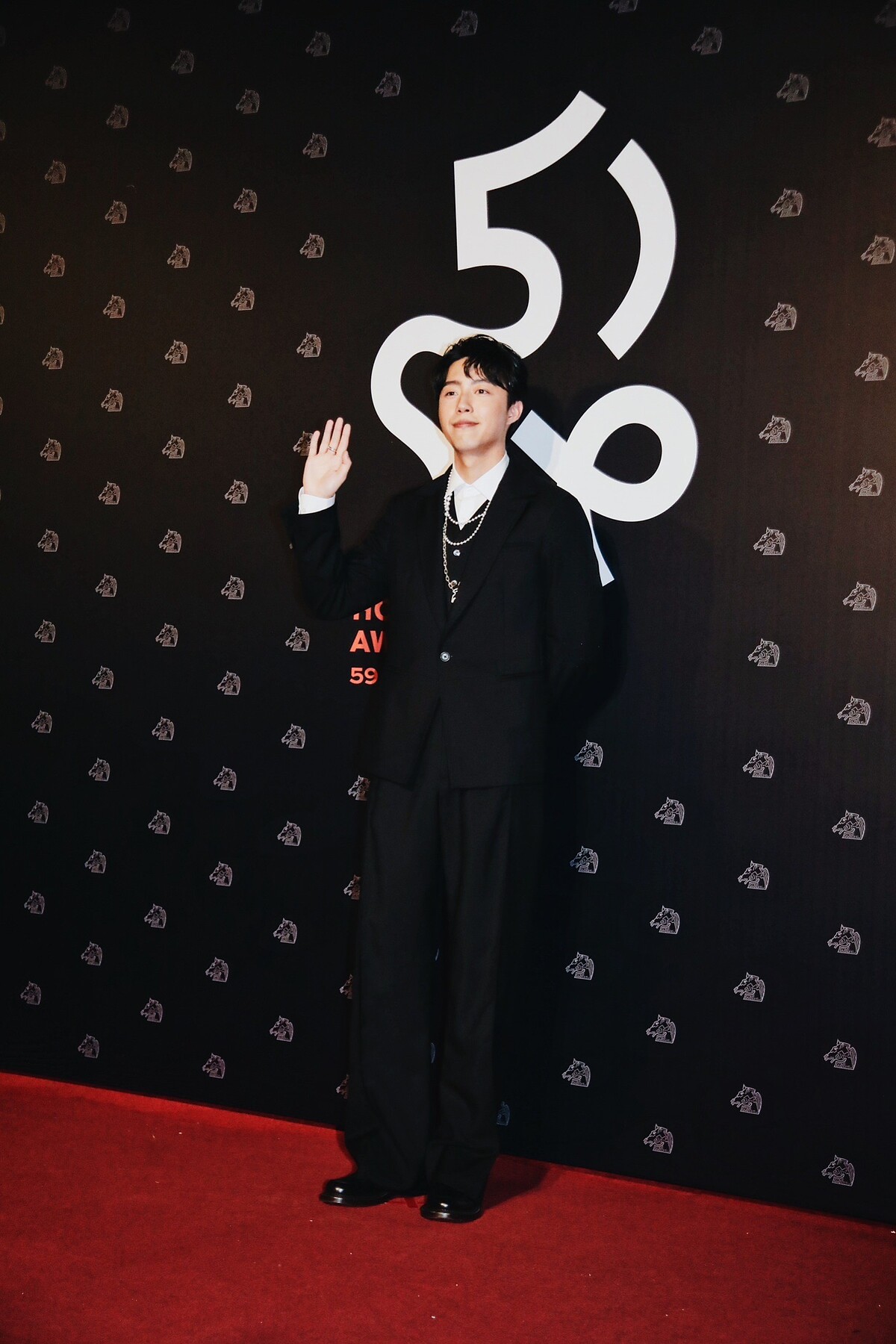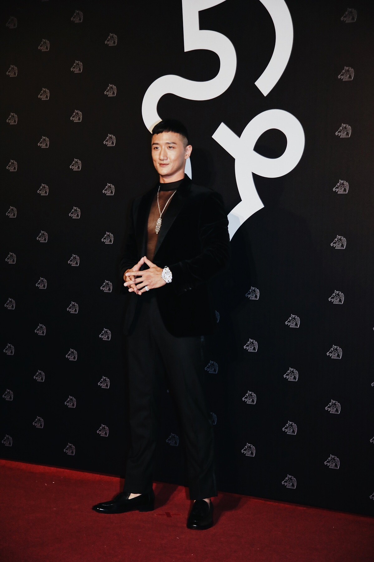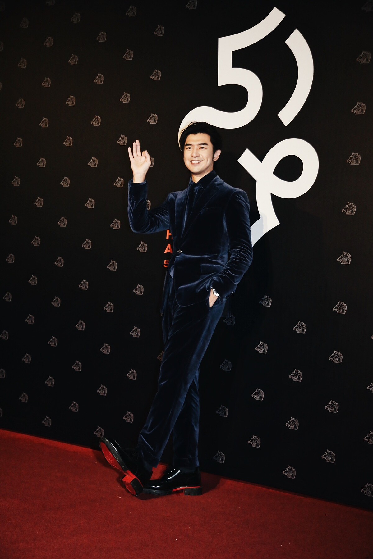 在各位男士以一片深色造型出席紅毯,宋柏緯聰明地用Mole'Neration灰綠色搭配亮橘色的造型來吸引焦點,絕對是今晚最佳配色穿搭!