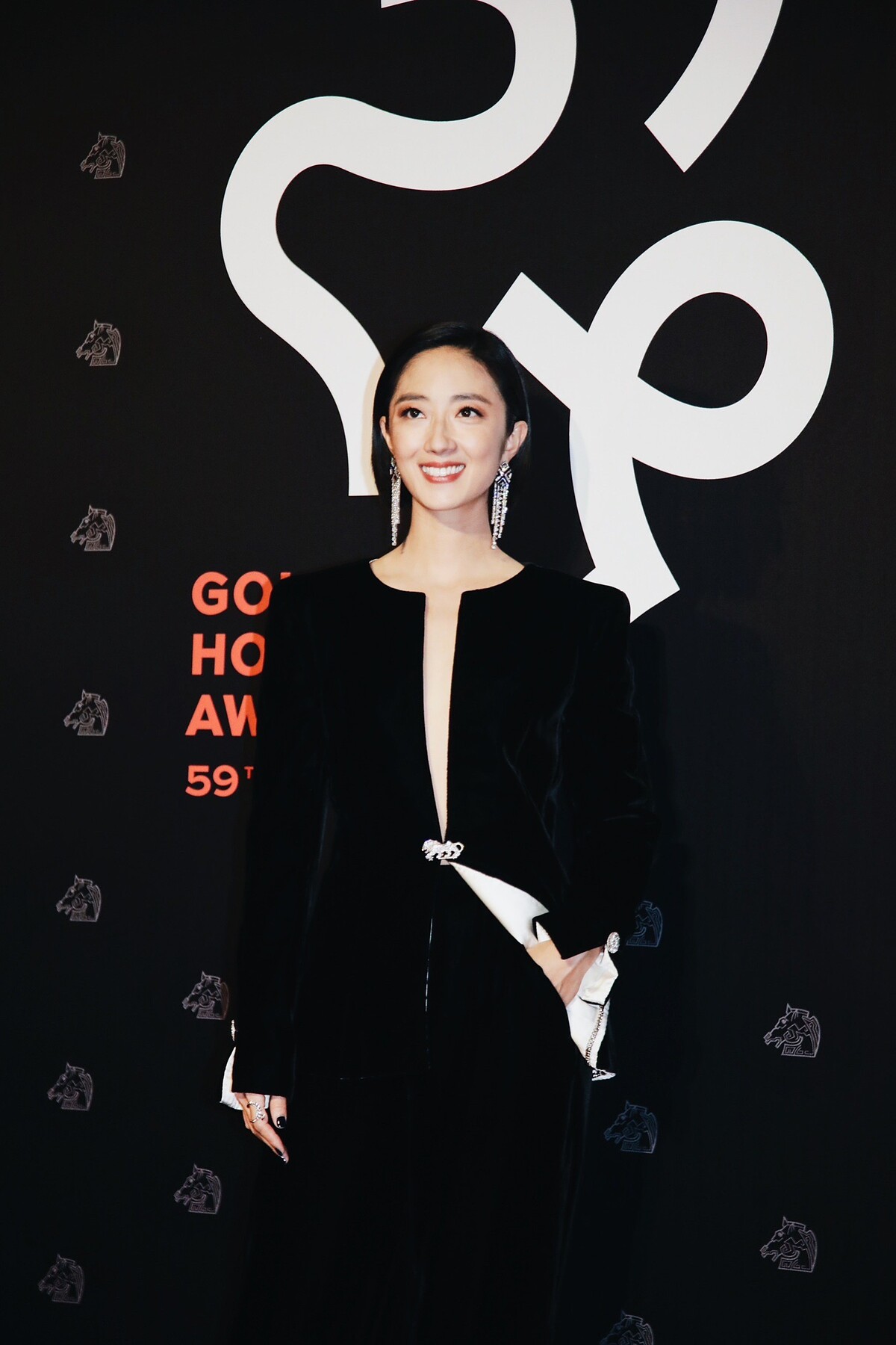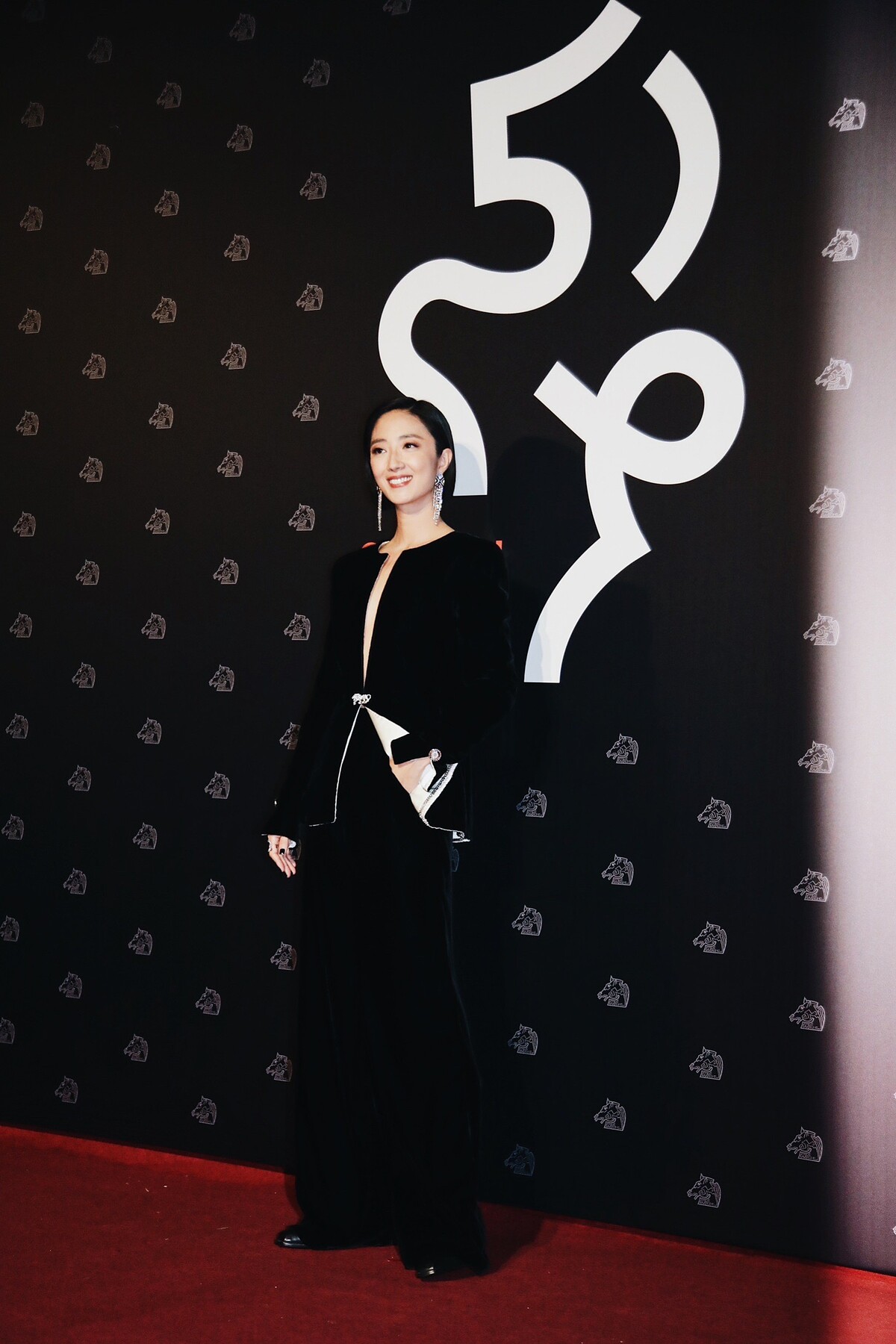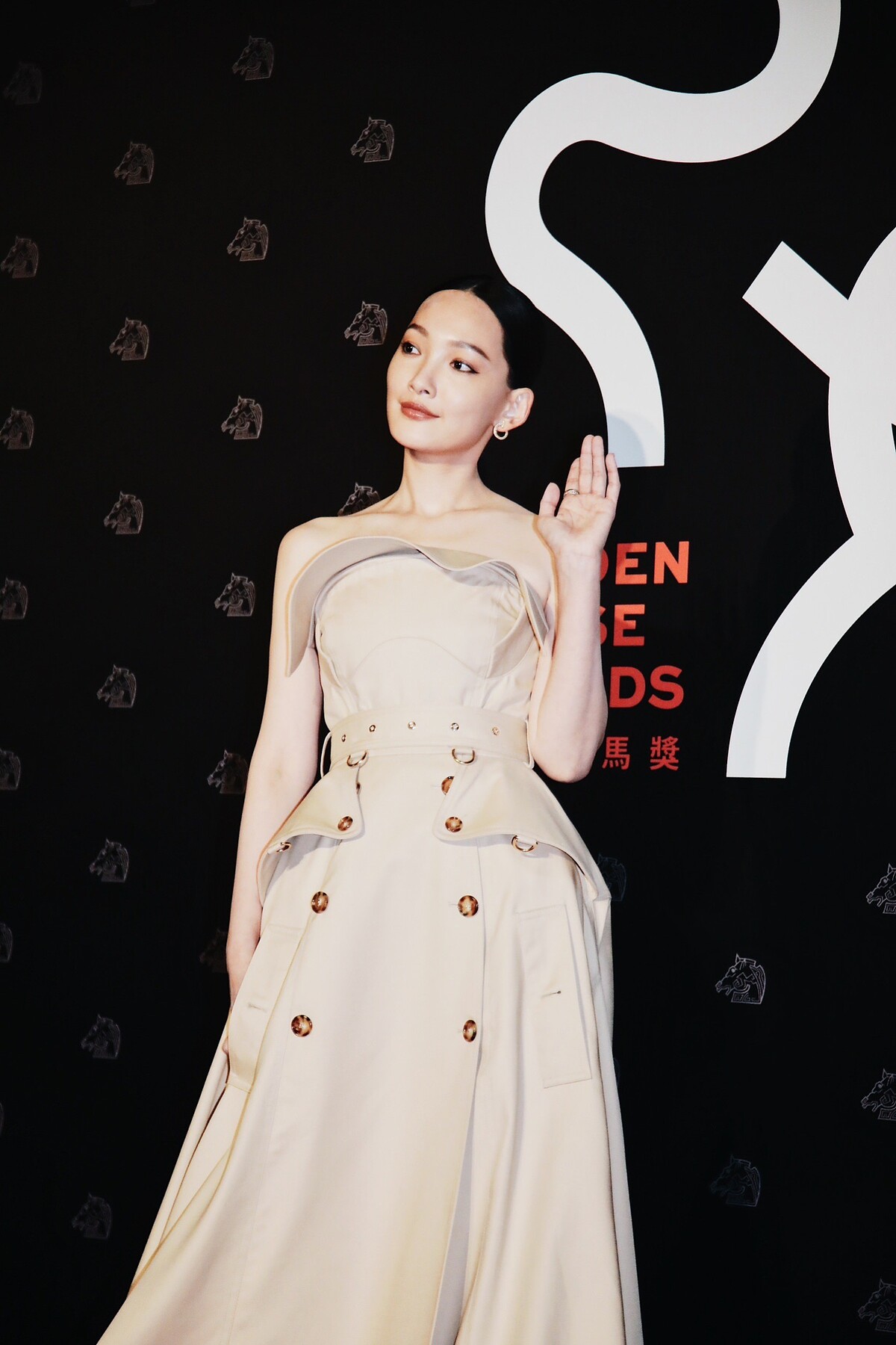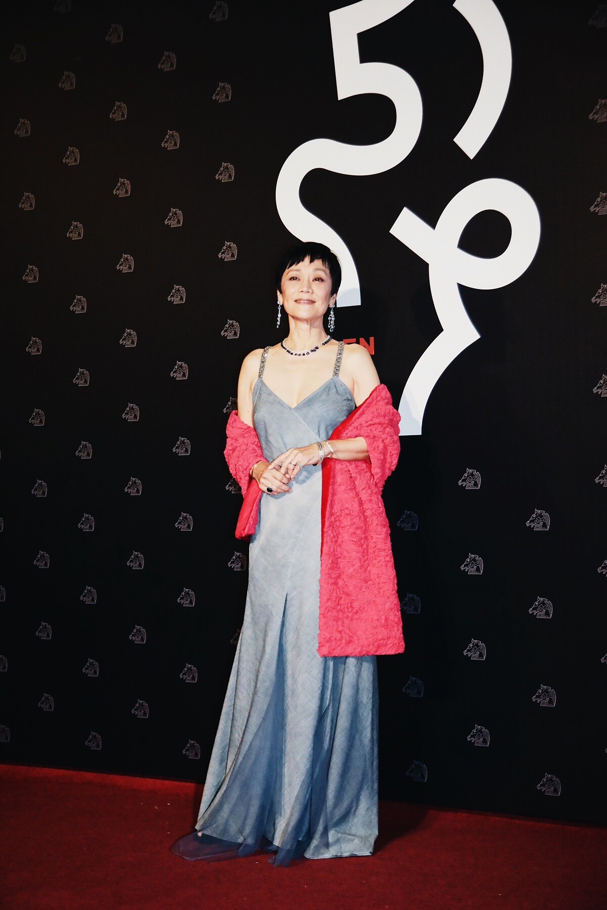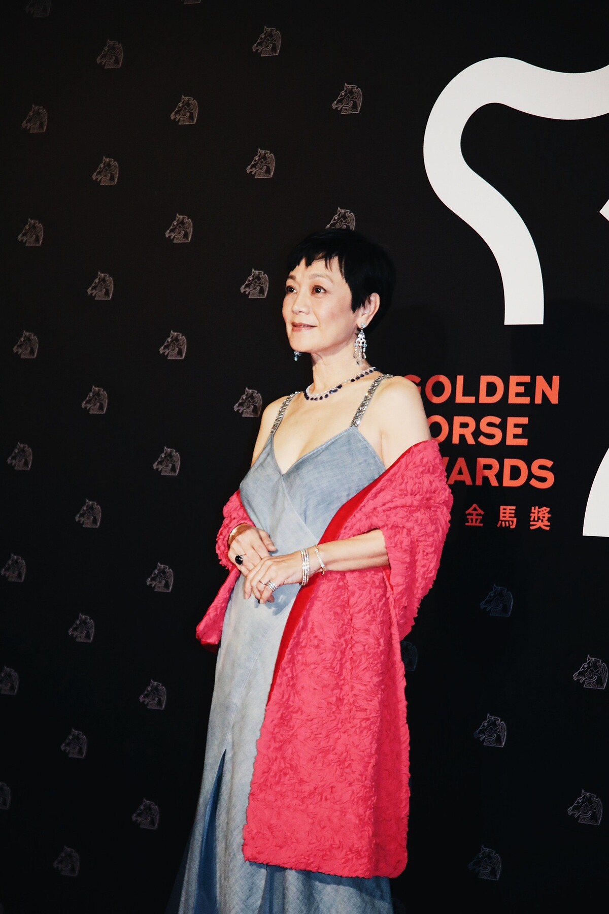 今年以《燈火闌珊》入圍的張艾嘉,俐落的短髮搭配霧霾藍色的細肩帶禮服,襯以粉桃色披肩,無疑是今晚星光大道最亮眼女星!