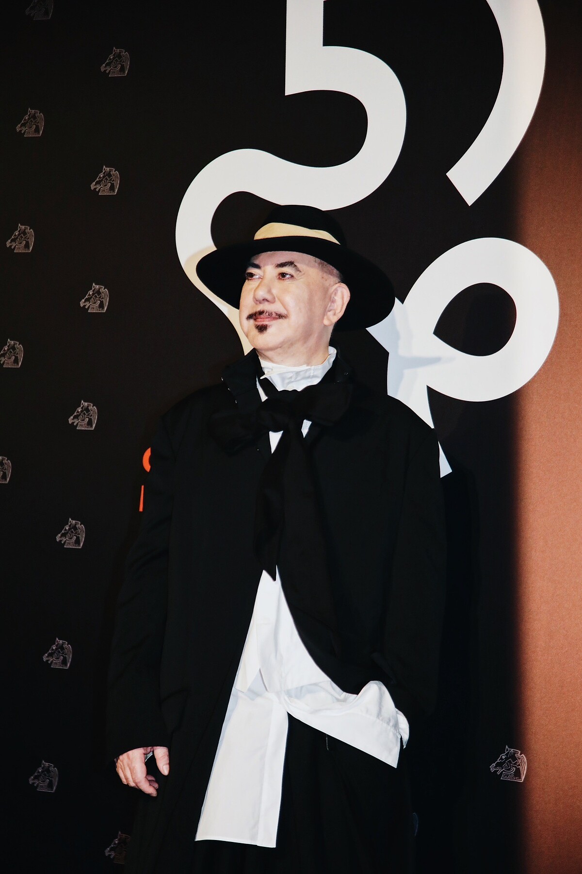 經典的黑白配色永遠都有精采的故事可期待,就像是今晚的黃秋生!飄逸的百摺下身,黃秋生簡單地和搭配黑色長褂、白色長版襯衫,紳士帽點綴,瀟灑又時髦。
