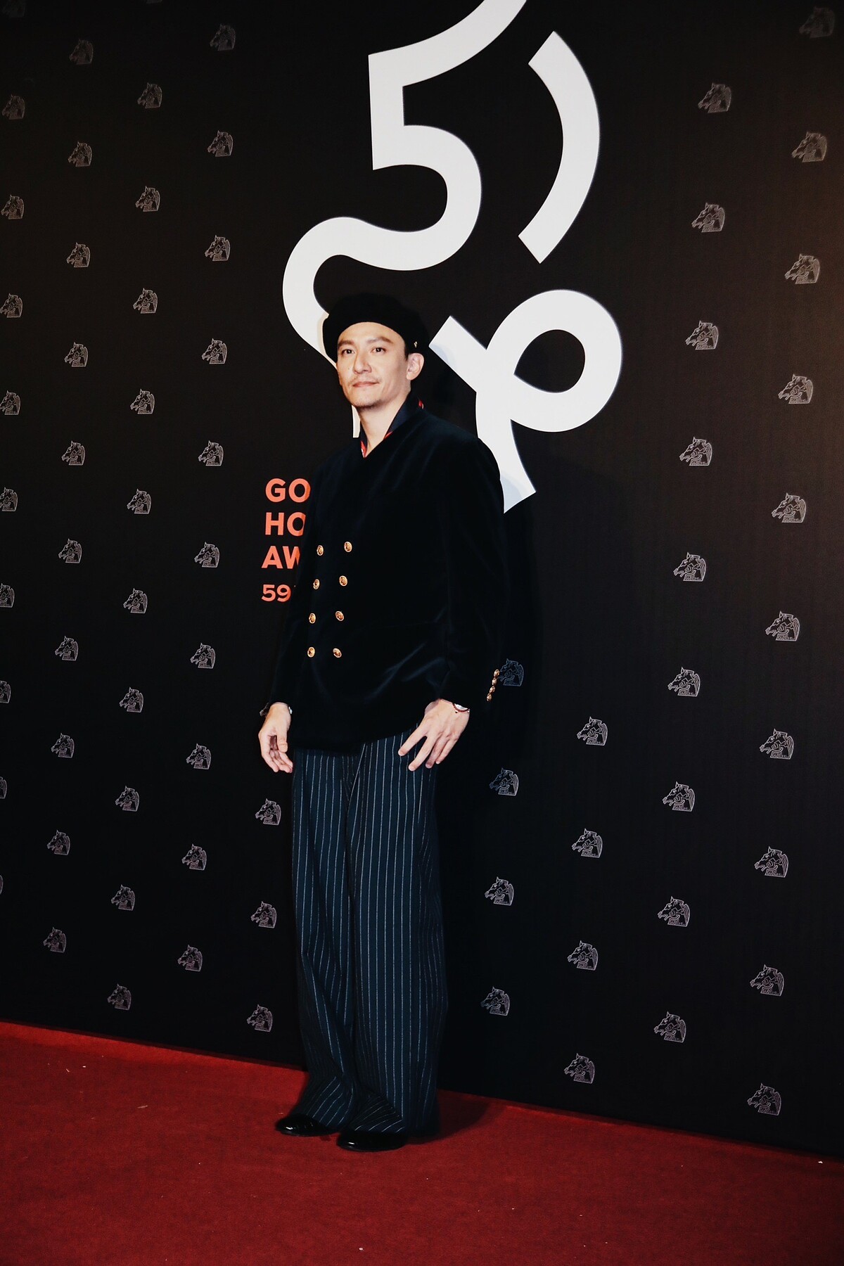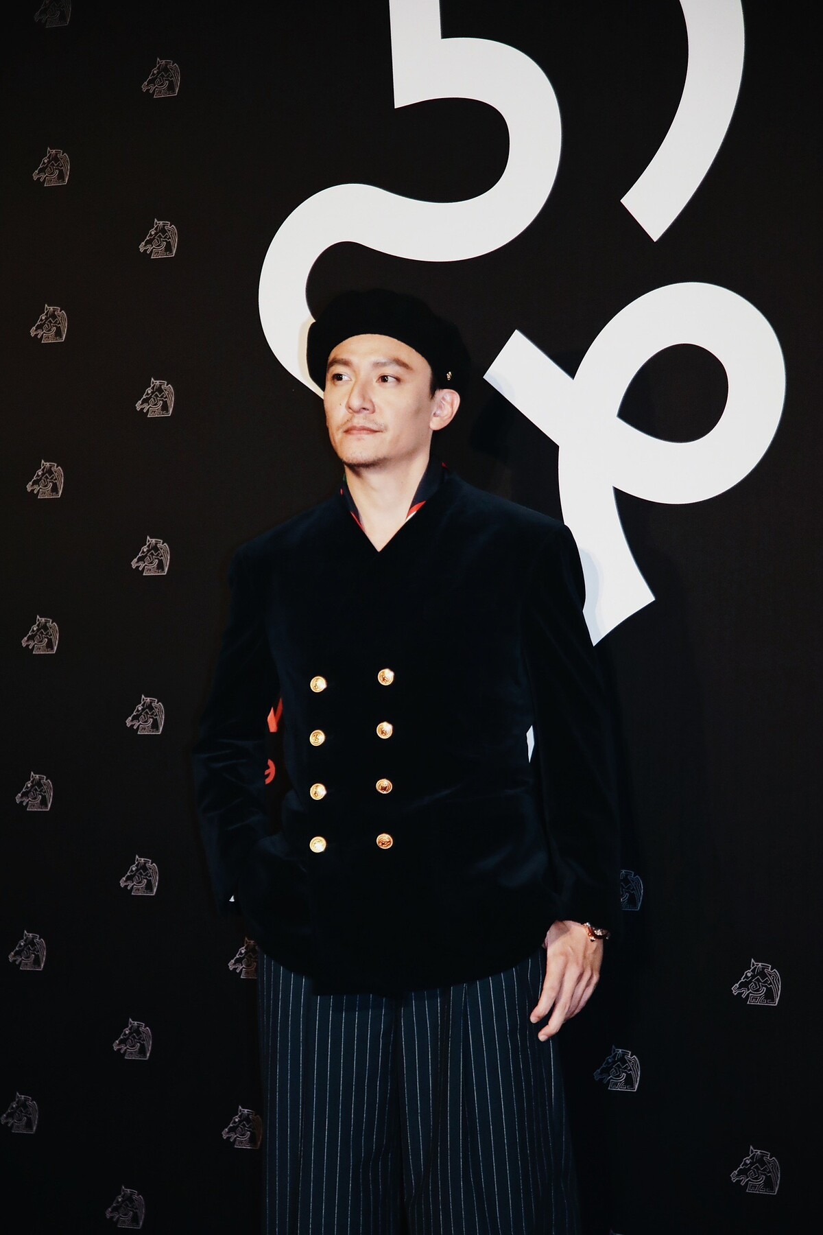 影帝張震身穿Gucci雙排扣設計搭配條紋寬褲,藝術感的蓓蕾帽搭配,呼應他今年的評審身份。
