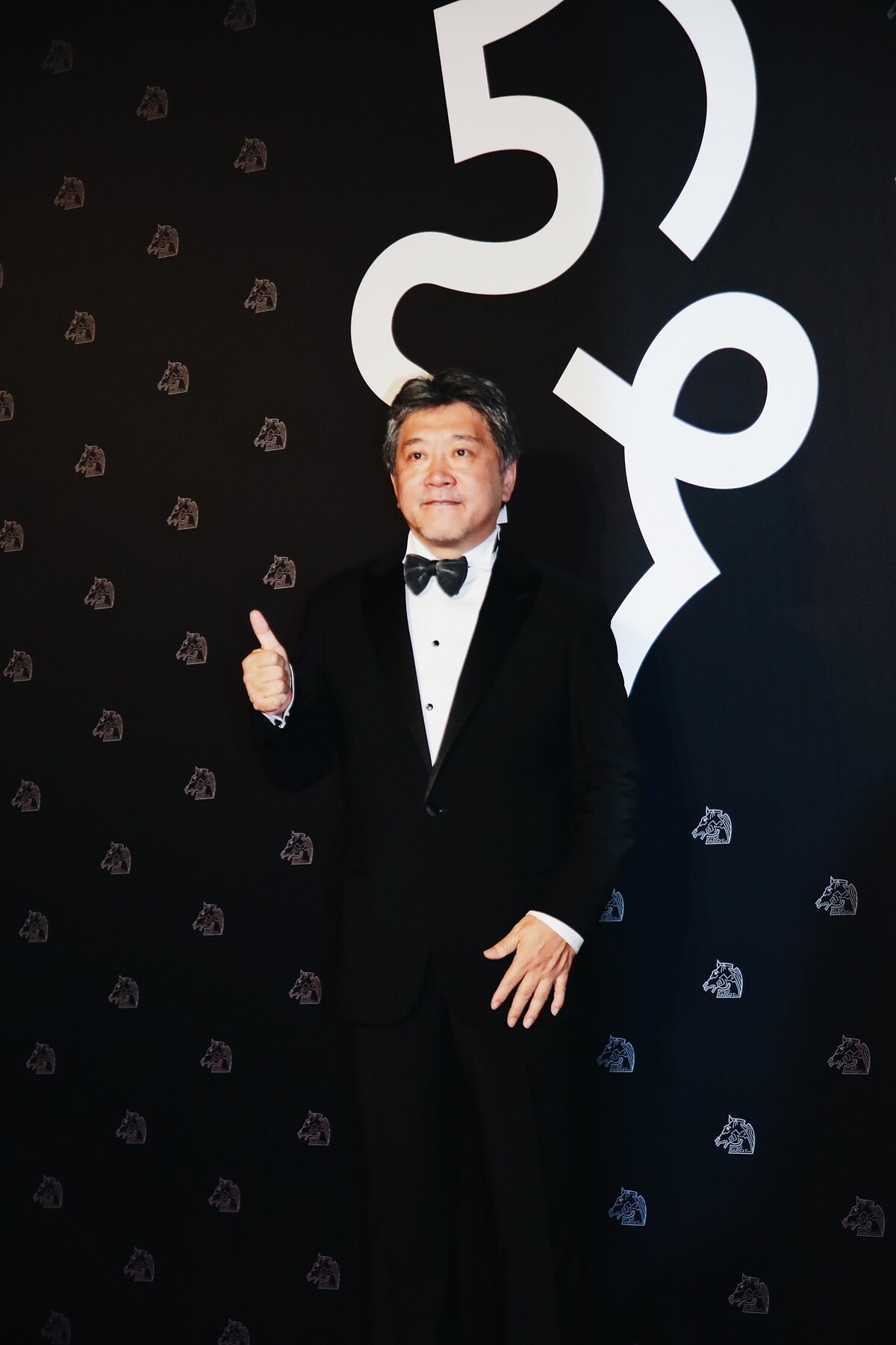 日本導演是枝裕和來台出席金馬獎,簡單的黑色西裝呼應他專業的導演形象。