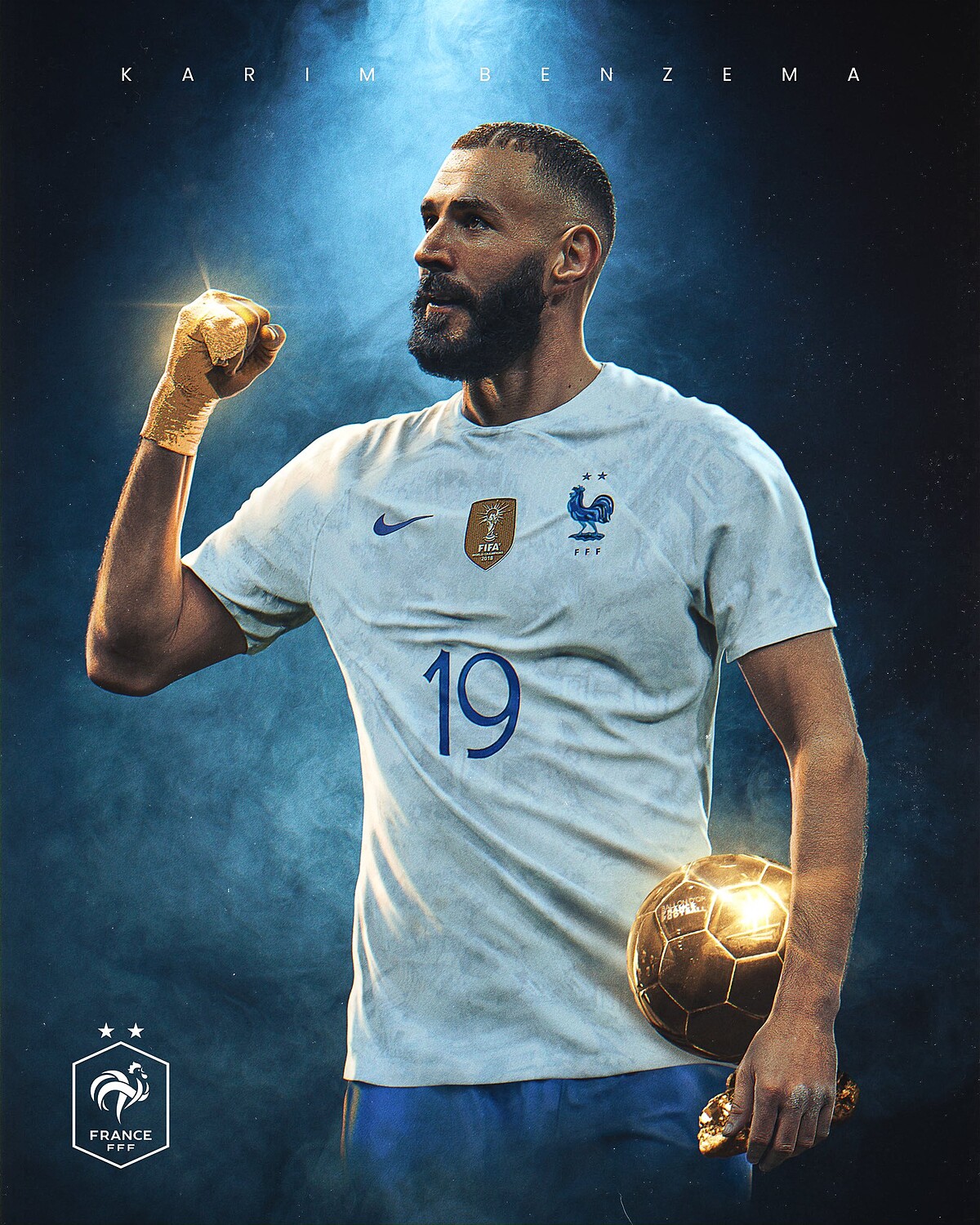 拿下上一屆冠軍的法國,2022世足賽的主隊球衣以沉穩海軍藍為主色,球衣上徽章、號碼和球員姓名則以金色點綴;客場球衣選用純淨的白色調,並將法國著名的凱旋門、克雷方丹訓練場地以藍色紋路印於背景。