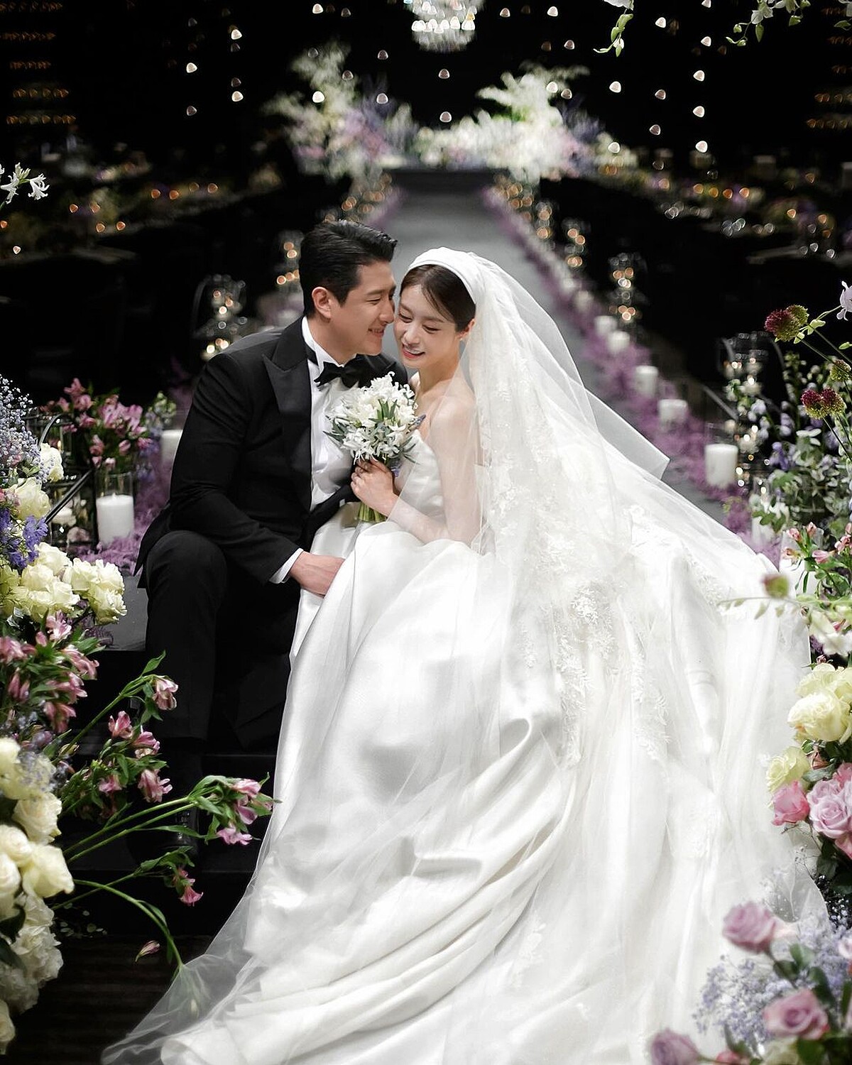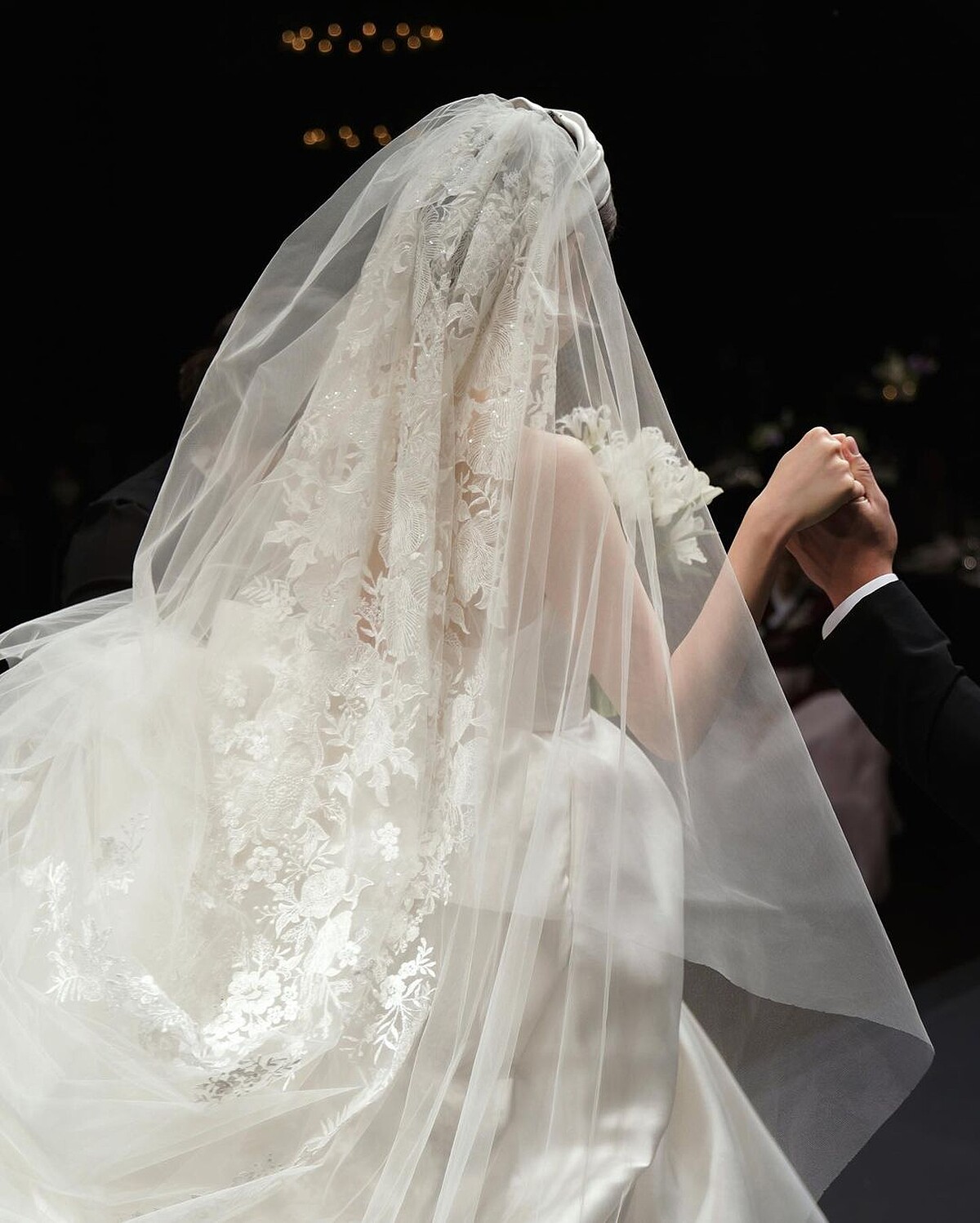 在大婚當日,芝妍選擇以緞面打造的純白婚紗,上半身獨特抽皺造型的設計,搭配浪漫的蕾絲頭紗,讓芝妍看起來就像是女神降臨,還能襯托出她的白皙肌膚。
