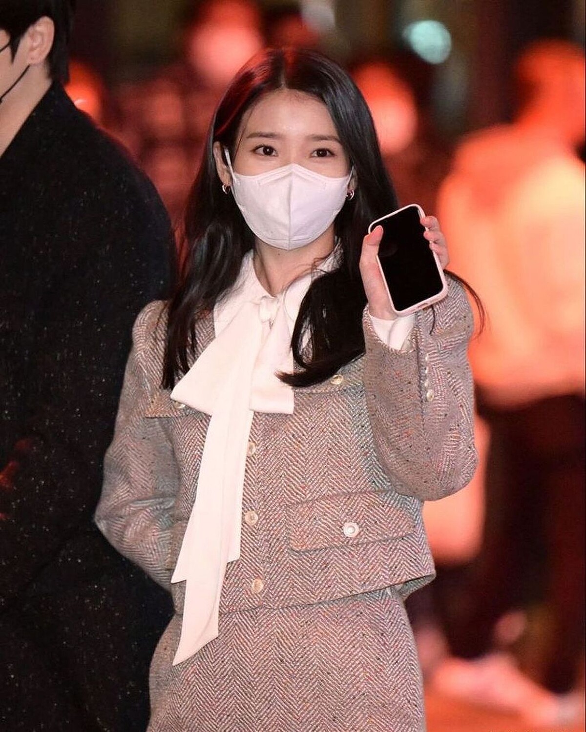 根本是婚禮歌手的女神IU,是芝妍的至親好友,婚禮當天不但第一個到場、獻唱祝福歌,還送芝妍一頂珍珠皇冠,而當日IU選擇白色領結襯衫搭配米灰色毛呢套裝,示範又氣質又禮貌的賓客穿搭。