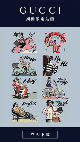 Gucci再次獻上質感免費的Line貼圖!一連8張動態貼圖,絕對是近日跟朋友聊天必須常用的時髦插圖。