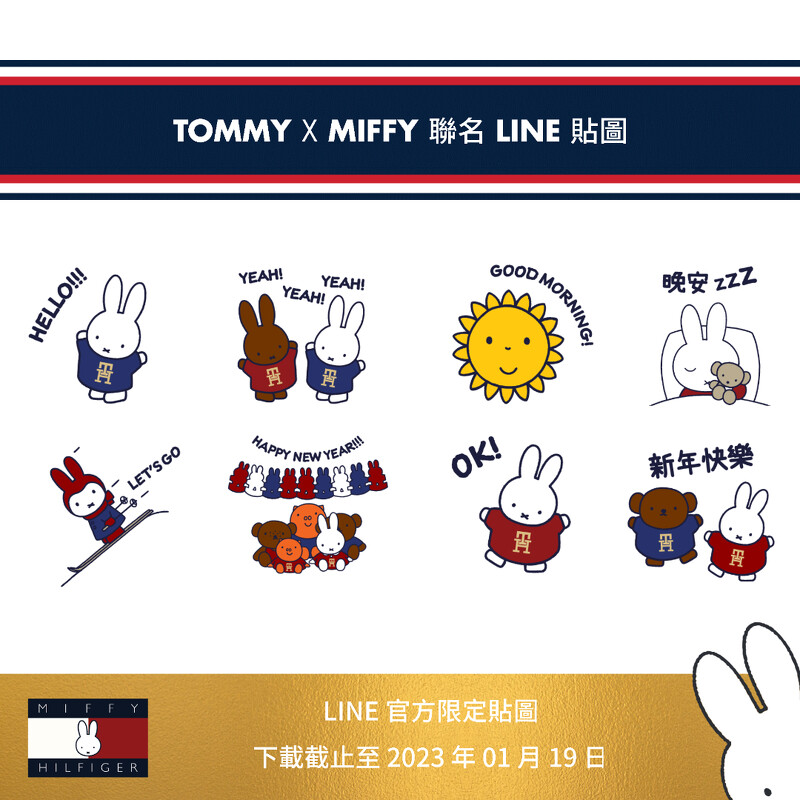 臺灣 TOMMY X MIFFY 聯名系列上架日期為 2022 年 12 月 20 日,在這重要的一天,TOMMY HILFIGER 特別將 Miffy 化作貼圖主角,融合經典標誌 TH Monogram 以及最具辨識性酒紅色與海軍藍,整個可愛到讓人融化!只要從 12 月 20 日至 1 月 19 日加入 Tommy Hilfiger LINE 官方帳號,即可免費下載 8 款靜態貼圖,讓聊天室每天都有身穿美式學院風的 Miffy 陪伴度過!
