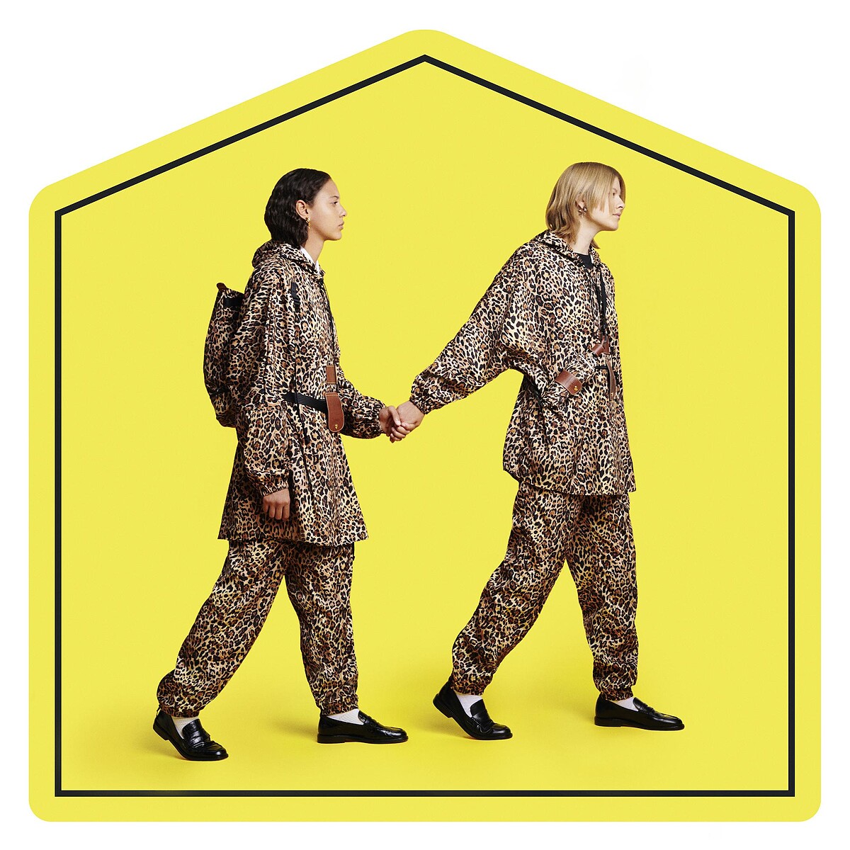不分男女的中性剪裁,是本系列當中唯一一件服裝單品。斗篷式的版型頗有率性的時髦感,尤其是豹紋樣式,絕對是雨天穿搭的一大焦點。