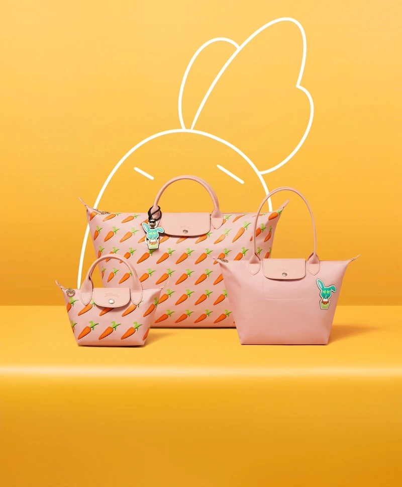 來自法國的Longchamp,迎接兔年的到來以浪漫粉色系,為品牌明星手袋尼龍折疊包換上可愛新衣,更搭配農曆生肖「兔」愛吃的胡蘿蔔圖案,並推出迷你包、旅行袋等不同尺寸的選擇。
