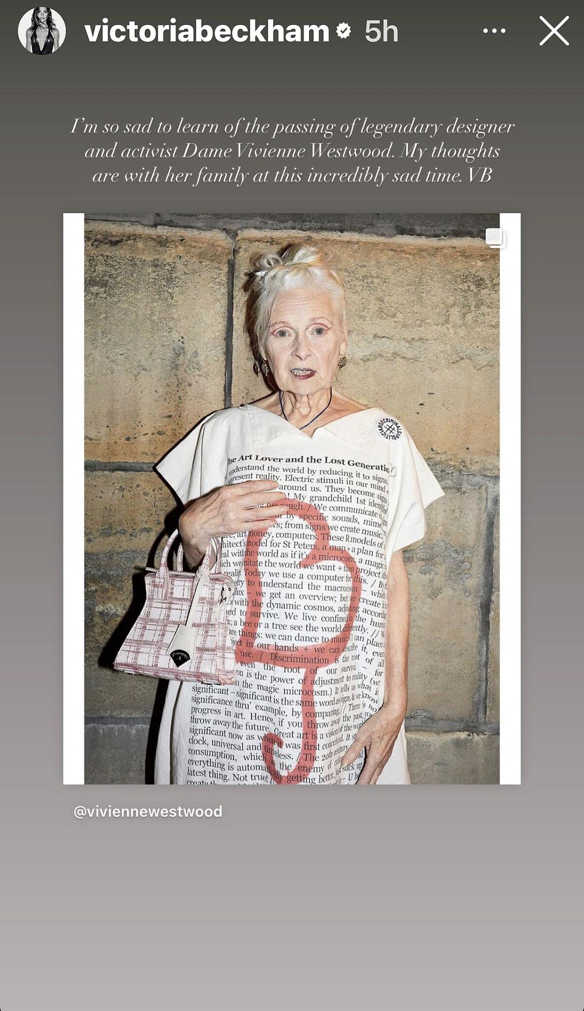 「我的心碎了。Vivienne Westwood讓我明白我可以做任何我想做的,穿我想穿的衣服,她是一代Icon,而我以自己的人生追隨著她的思想。將來沒有人能夠取代你,但是我們會持續為你所做得一切奮鬥。」