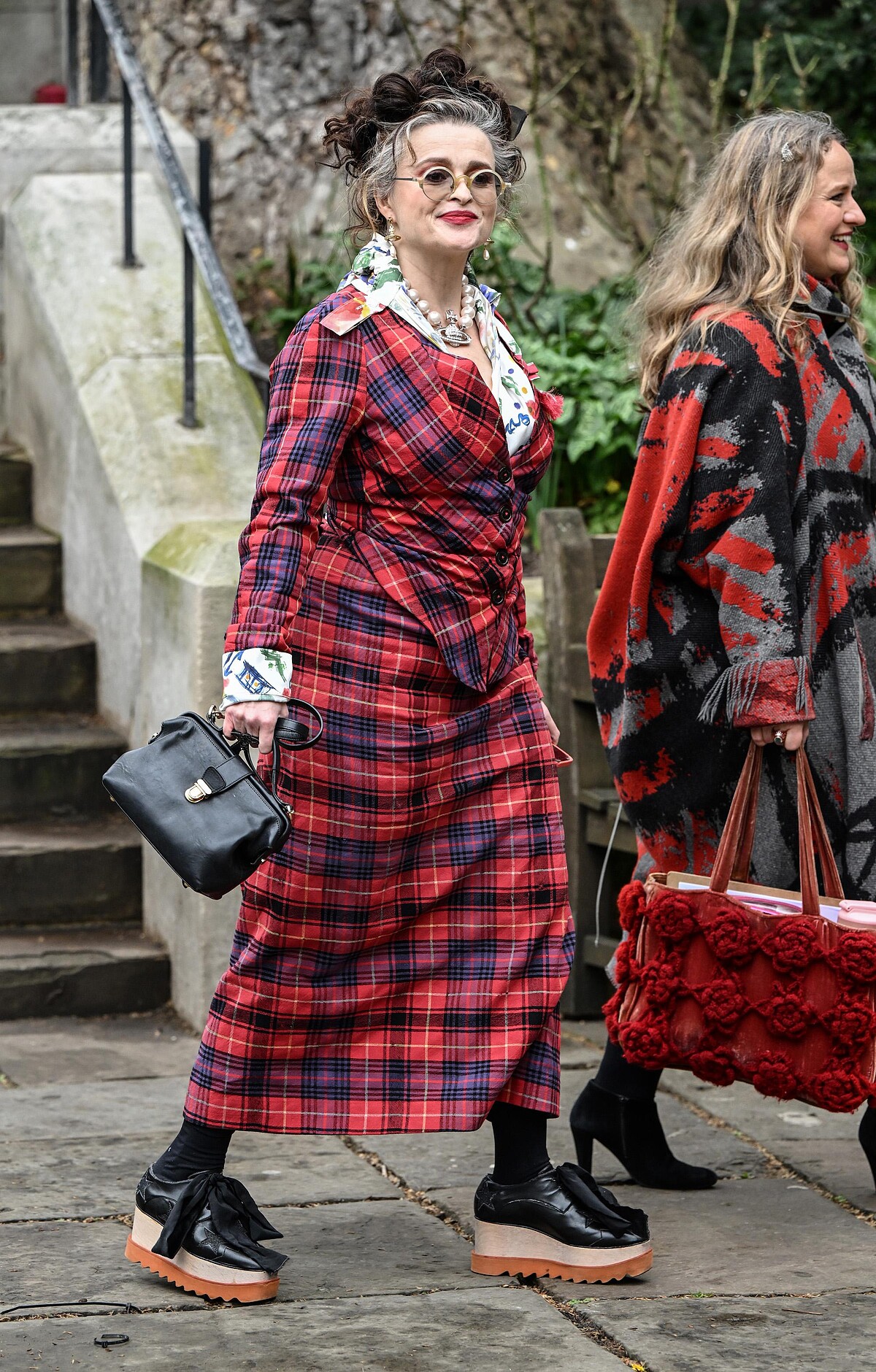 雖然是告別式,不少賓客跳脫以往的素黑,反以亮眼的大紅色穿搭出席,例如紅心皇后Helena Bonham一身紫+紅的格紋連身裙,哀樂莊妻的氣氛似乎更符合龐克教母的活力與叛逆精神。