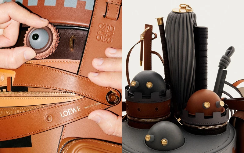 除了上圖的迷你版,Jonathan Anderson把Bracelet Pouch、Puzzle、Flamenco以及Amazona包全用上,還原動畫中城堡外觀的煙囪、鐵件製成另一個大包版本,這些包包也都可以隨意拆卸,花一筆一次收齊4大Loewe包款。
