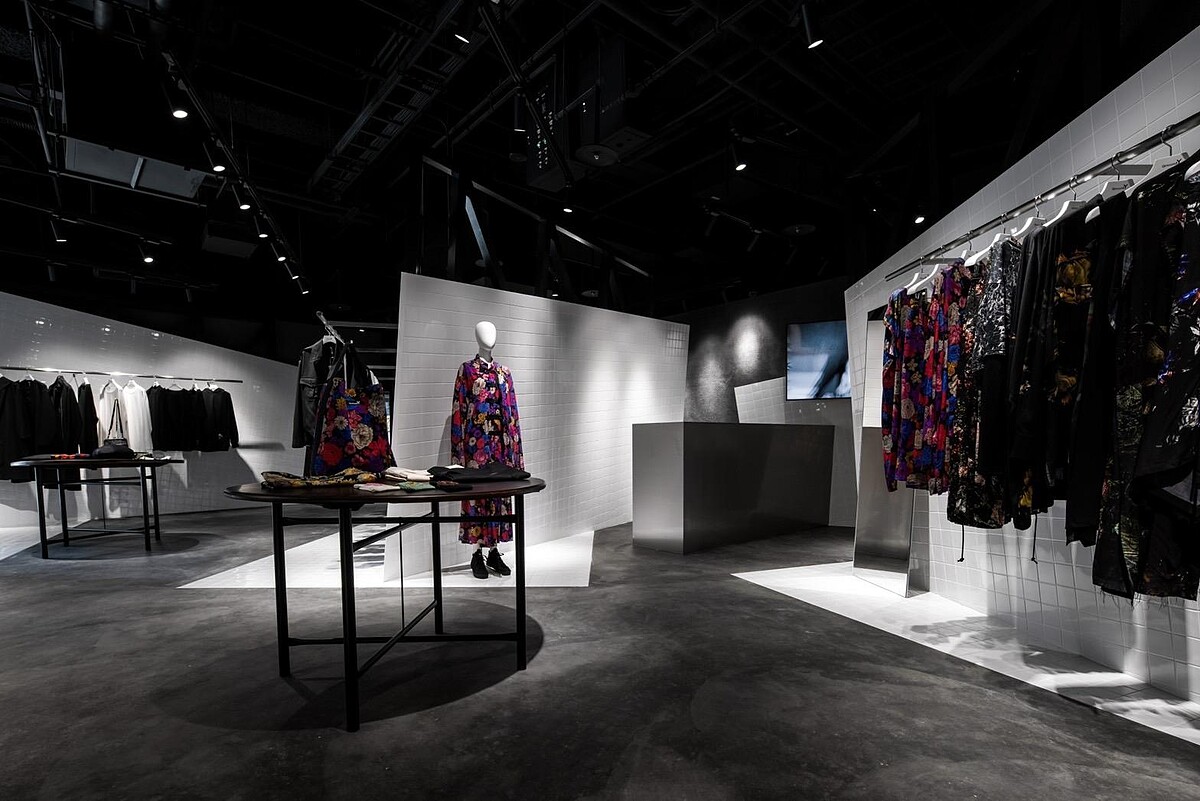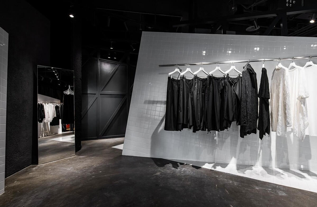 選址在信義微風百貨,遠遠看到極簡的黑白色調店舖就可以知道是山本耀司的地盤。一進到店裡映入眼簾的是:個性的水泥漆地,搭配上大面積的白色磁磚與黑色鋼架,你或許會好奇為什麼會把衛浴空間的磁磚應用在服飾店的裝潢?
