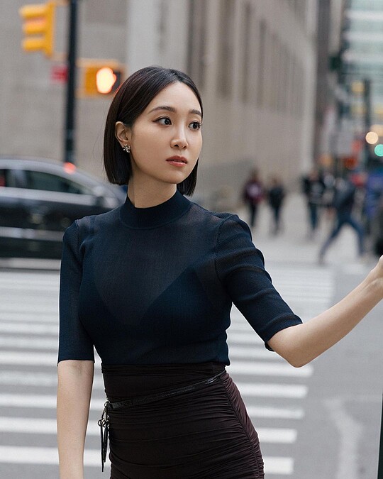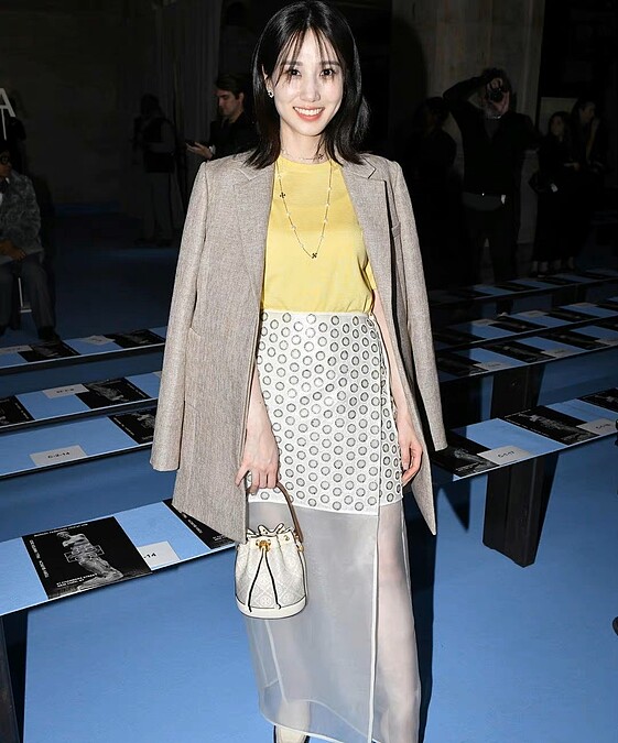 朴恩斌在秀上,則是一改在機場時後的活力感,穿上微透膚的裙裝,再披上一件長版西裝外套,展現優雅、幹練的一面,當然還略帶點小性感。