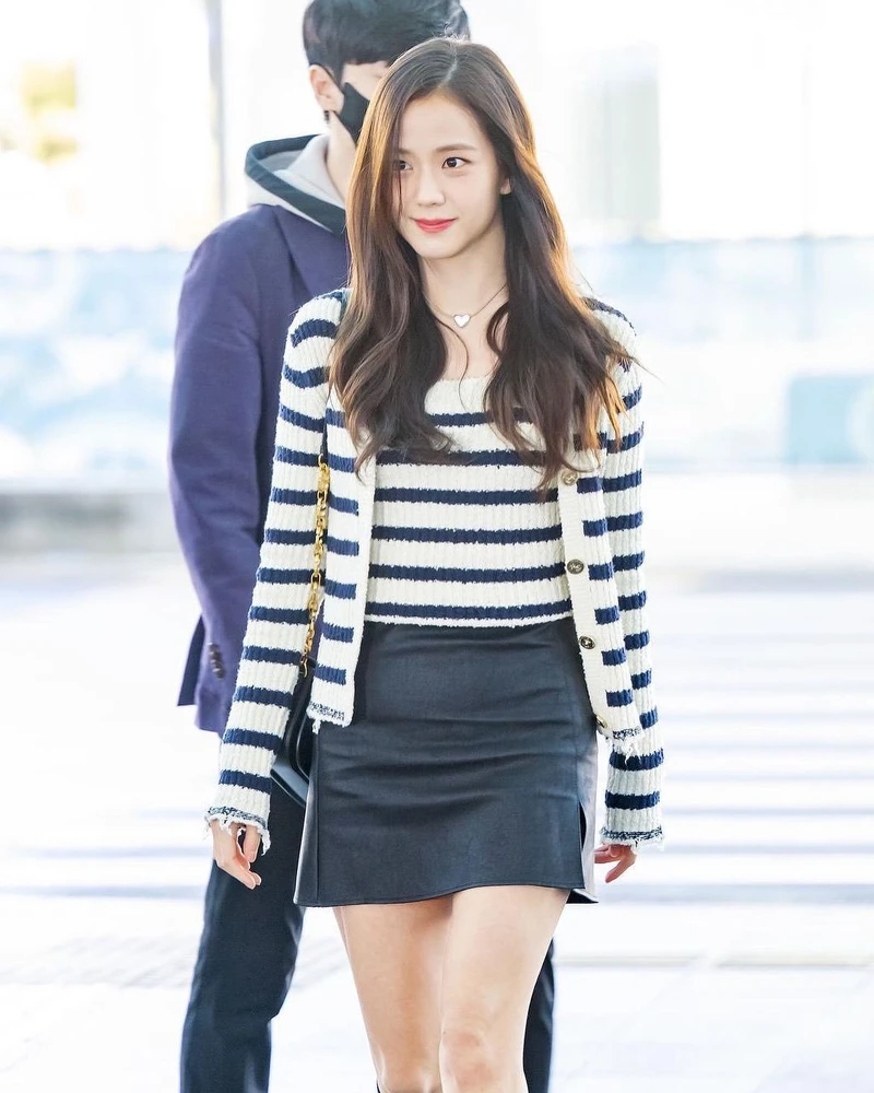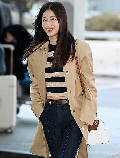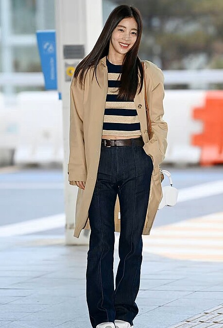 為了Michael Kors 2023秋冬大秀從仁川機場準備飛往紐約的奇恩世,選擇一件黑白條紋上衣、牛仔褲,微微露出性感小蠻腰,外面罩上卡其色風衣外套,直接化身氣質小姐姐,這套穿搭也很值得女孩們取經。