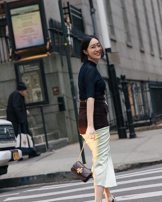 和朴恩斌同樣受邀出席Tory Burch大秀的,還有剛宣佈再度懷孕的楊祐寧老婆Melinda,而她特別以黑色透膚上衣,搭配湖水綠裙裝,展現出優雅又性感的女人味,一點也看不出懷孕了呢。