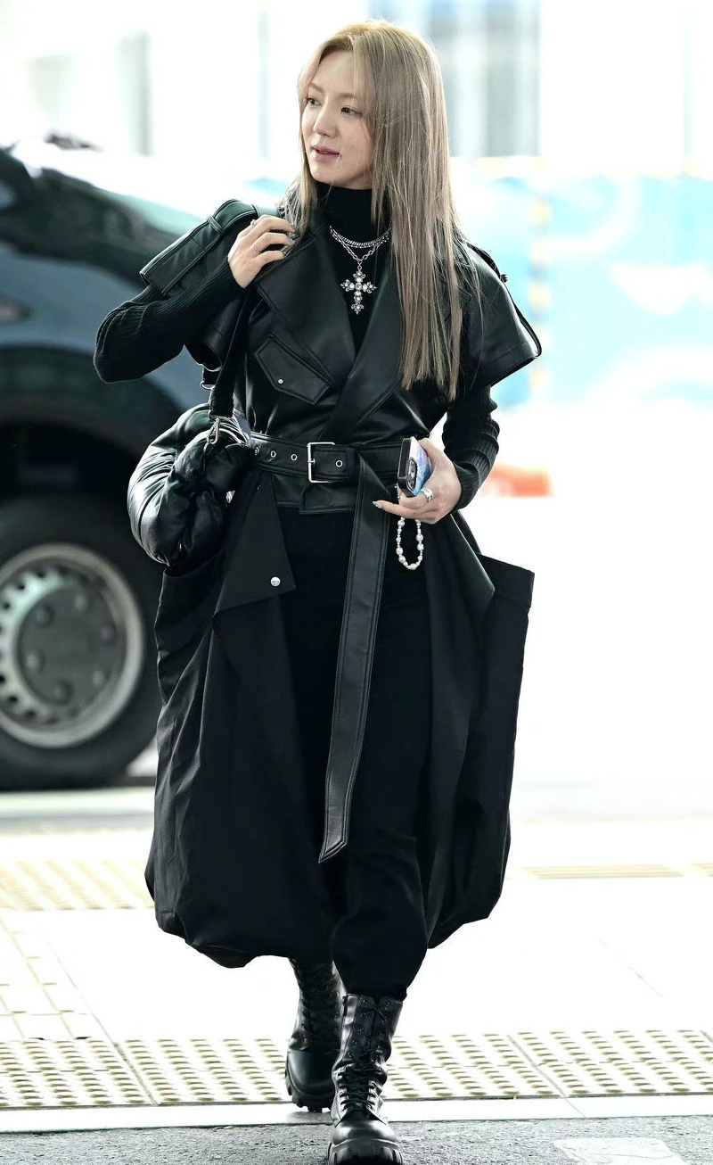 擔任紐約時裝週「Concept Korea」官方形象大使的少女時代成員孝淵,頂著招牌金色長髮、穿著黑色長版皮風衣,帥美出現在仁川機場。