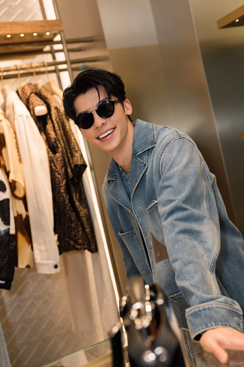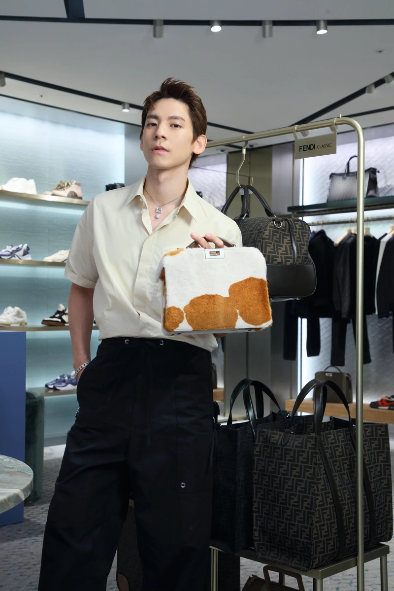 漢寶則是換上FF Logo抽鬚T-Shirt、刷色效果牛仔褲,再罩上一件擴型抽鬚牛仔外套,展現陽光男孩的迷人風采,而他更挑選了Fendi經典包Peekaboo ISeeU為整體造型增添亮點。