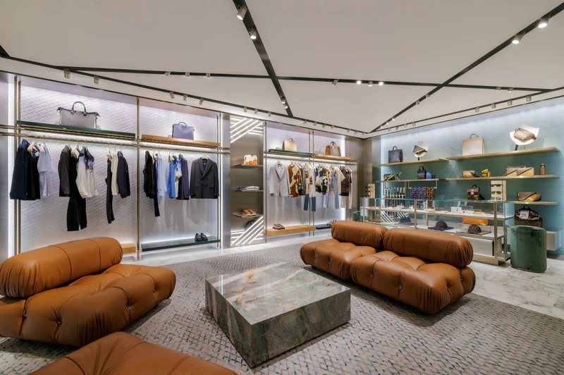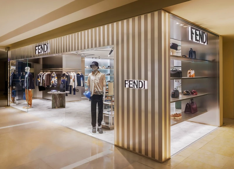 新登場的Fendi台中新光三越男裝店,位於台中新光三越二樓,約111平方公尺的購物空間,採用Fendi One的設計概念打造而成。店鋪以綠色和駝色為主色調,正門口運用銀色金屬光澤條紋營造出奢華感,店內的懸掛式陳列架也與金屬光澤的門面呼應,還有Karl Lagerfeld於2013年秋冬系列推出的FF Logo圖案製作的手工銀色石膏牆,都是Fendi台中新光三越男裝店不容錯過的亮點。