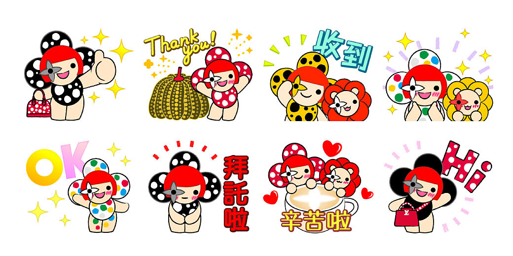 不單是藝術界陷入瘋狂,也讓時尚迷無條件買單!8張限定貼圖以一系列日常對話用語展開,包含「OK」、「謝謝」、「哈囉」等等,M編個人大愛路易威登品牌吉祥玩偶Vivienne致敬草間彌生的紅色齊瀏海短髮造型,根本是引領穿搭先趨。